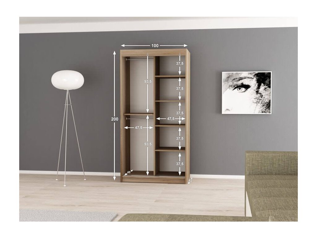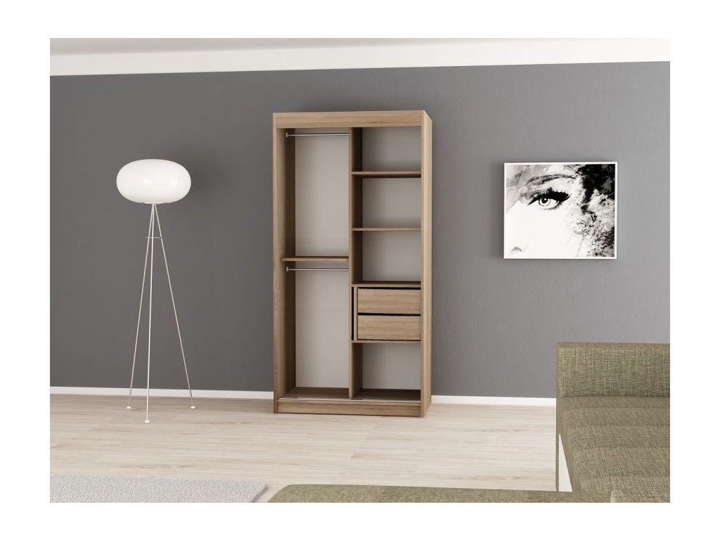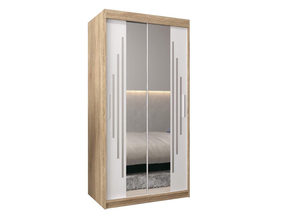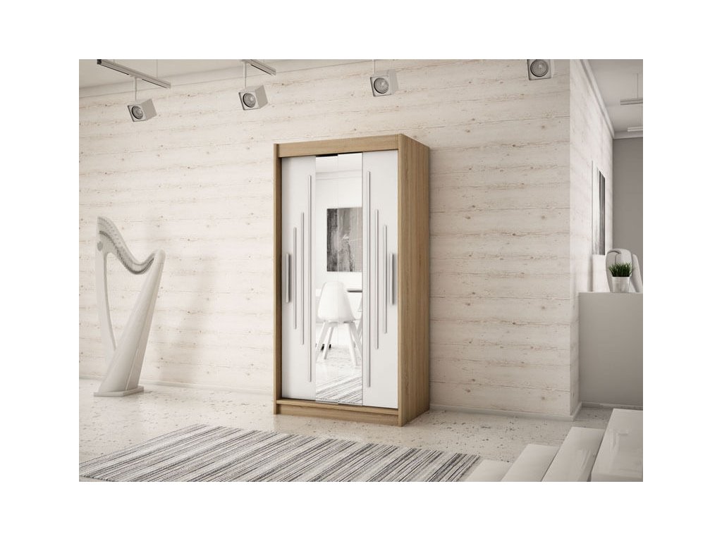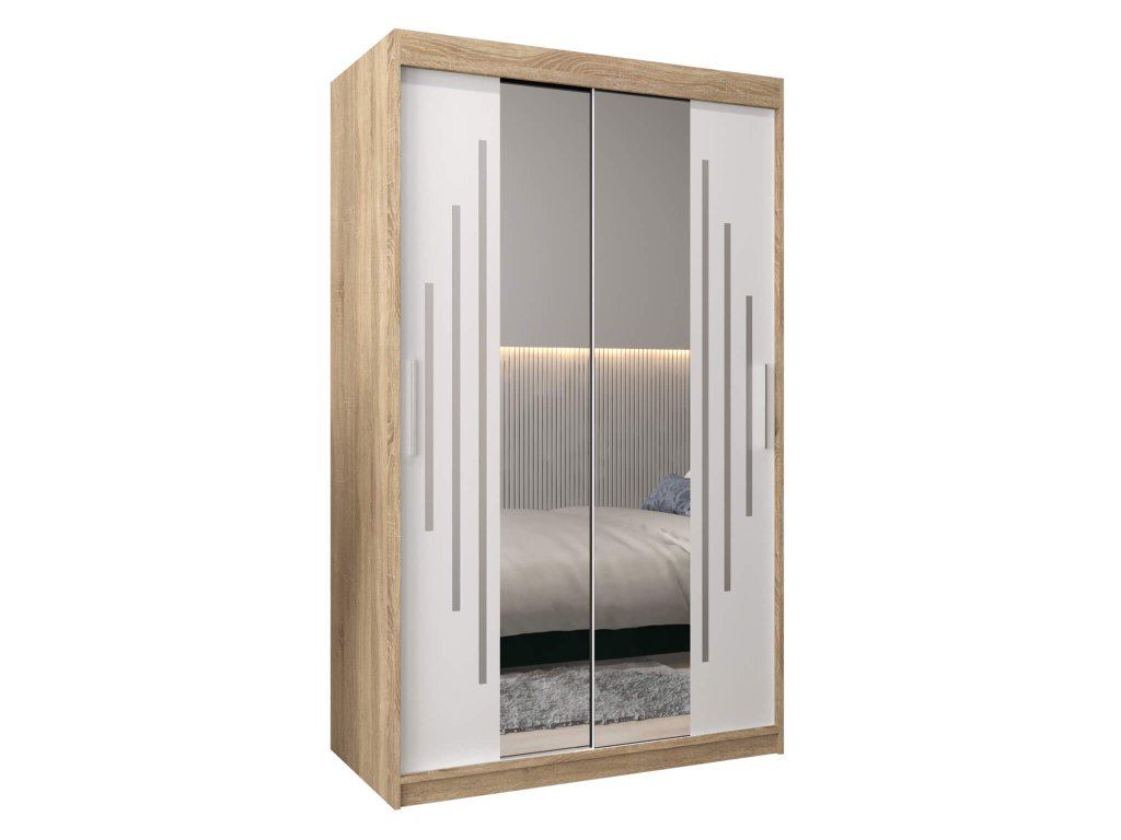 A sonoma tölgy és fehér szín kombinációjában készült gyönyörű tükörrel és fogantyúkkal ellátott BETHANY tolóajtós ruhásszekrény nagyon praktikus. DTD bútorlapból készült, melynek szélei PVC élekkel vannak biztosítva. A BIMAK záródó rendszernek és alumínium vezetőseknek köszönhetően a tolóajtók kényelmes záródása biztosítva van. A szekrény belseje két részre van osztva.A jobb oldalon négy polc található, amelyek öt praktikus tároló rekeszt hoznak létre, melynek köszönhetően elegendő helyet biztosítanak a ruhák tárolására. A szekrény bal oldalában egy polc és két akasztórúd helyezkedik el. A modern gardróbszekrény biztosan feldob majd minden szobát.