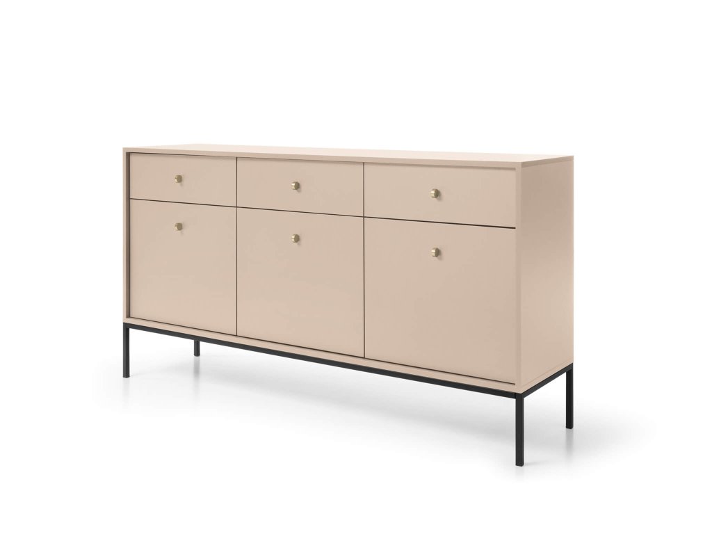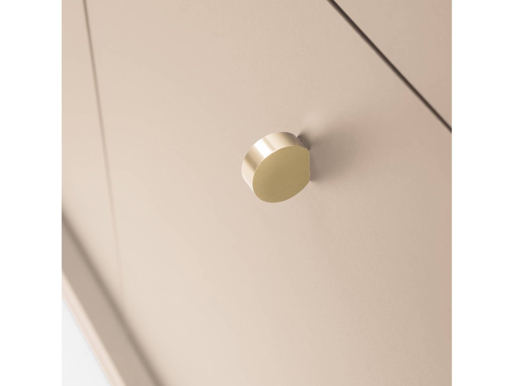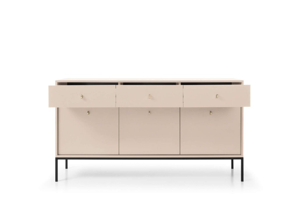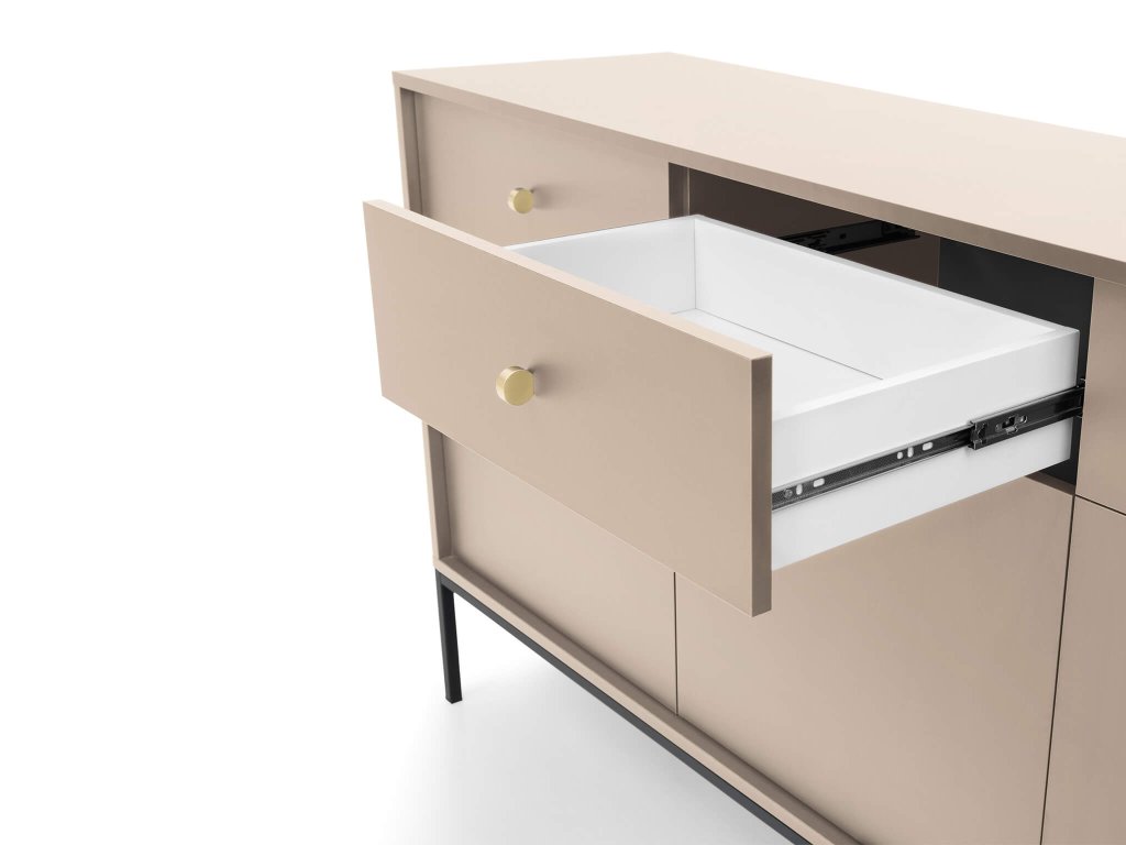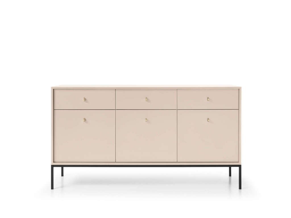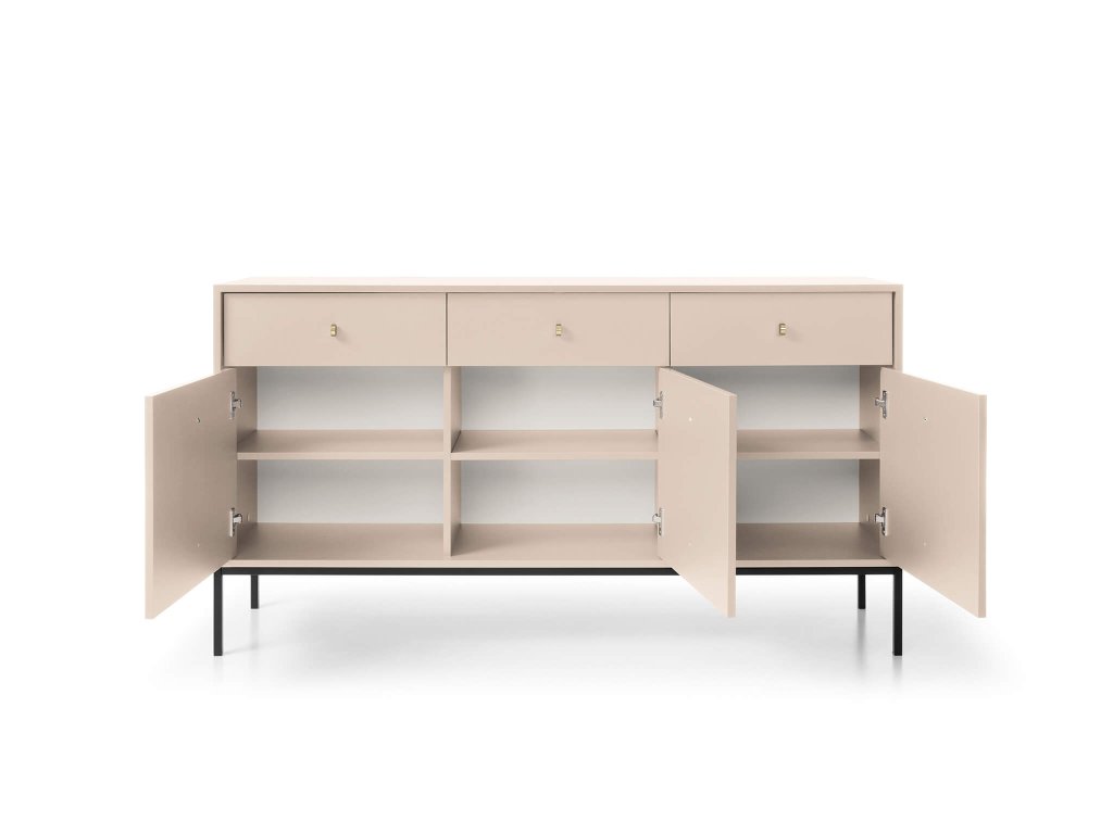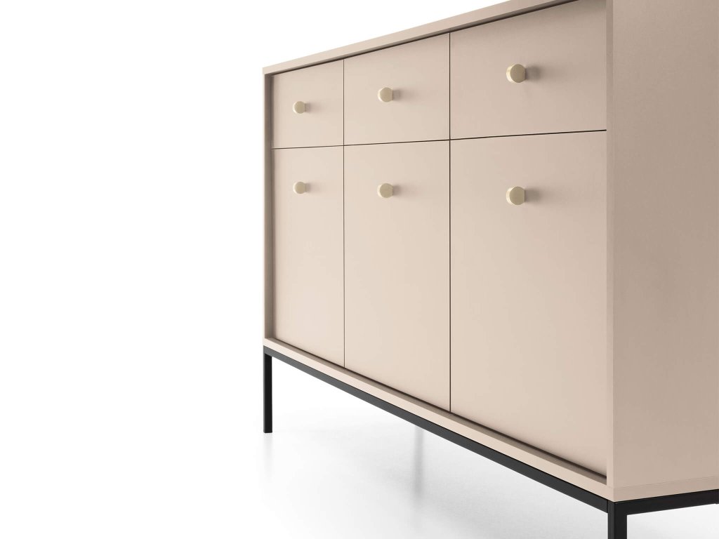A tágas bézs Bono SZ154 komód minőségi laminált 16 mm vastag DTD bútorlapból készült, amely ABS élekkel biztosított a hosszabb élettartam érdekében. Az ajtók tanúsítvánnyal rendelkező 16 mm vastag DTD bútorlapból készülnek, szintén ABS élekkel. Az elegáns arany színű fém fogantyúk és a fekete fém lábak tökéletesítik a minimalista dizájnt. A komód három kis szekrénnyel és három fiókkal rendelkezik. Minden ajtó mögött egy-egy polc található.