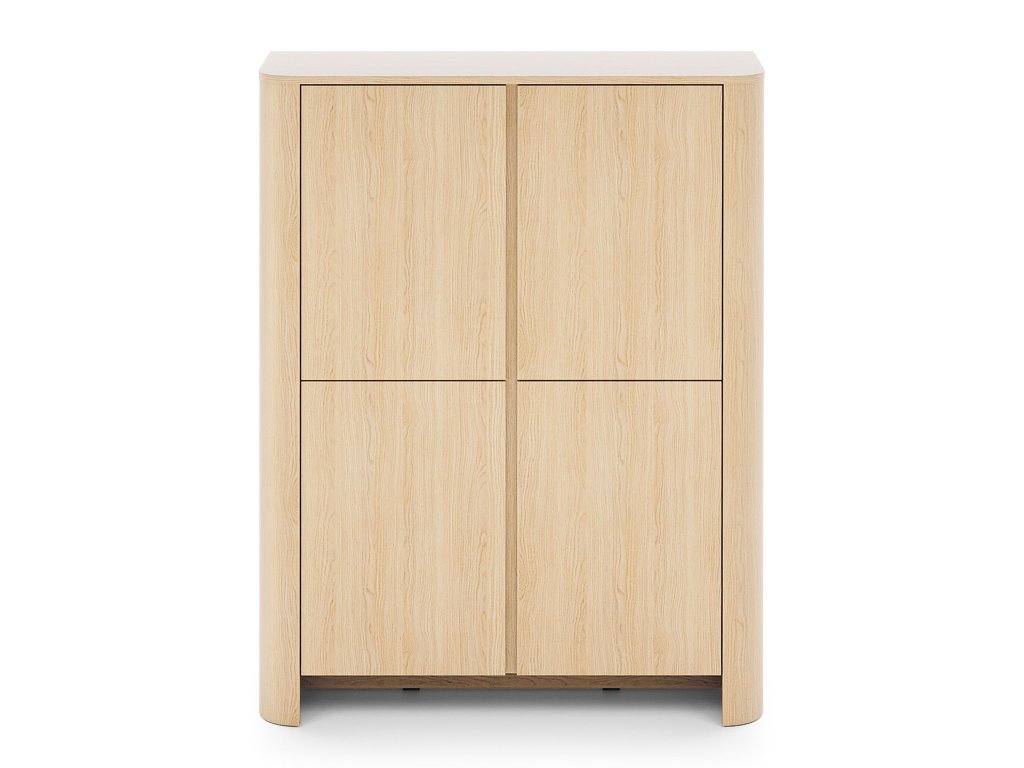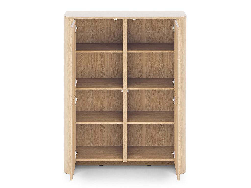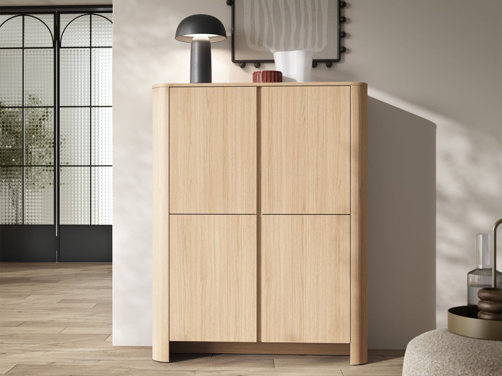 A meleg vicenza tölgy színben készült minőségi magas BORI komód elegáns megjelenést kölcsönöz a szobának. A 103 x 39 x 132 cm-es nagy méretnek köszönhetően számos tárolóhelyet biztosít. Négy ajtóval rendelkezik, amelyek mögött polcok kaptak helyet. Az átgondolt belső elrendezés bőséges tárolóhelyet biztosít a ruháknak, kiegészítőknek vagy dokumentumoknak, így minden könnyedén rendszerezhető lesz. Az elegáns lekerekített élek és a push-to-open rendszer pedig modern, letisztult összképet teremtenek, hagyományos fogantyúk nélkül.