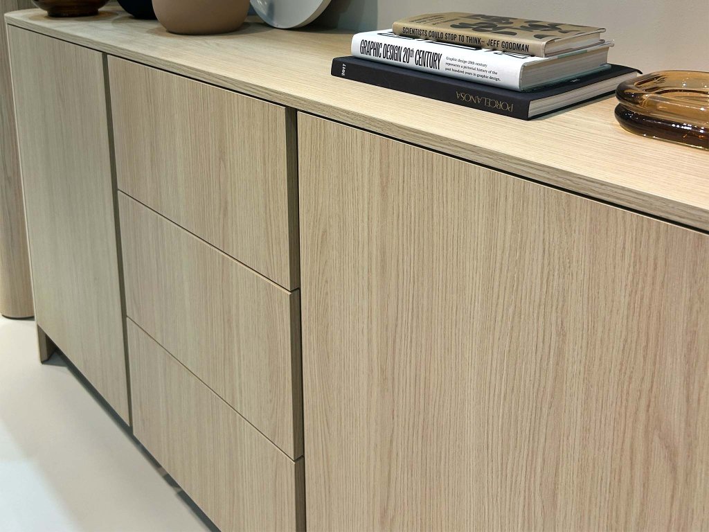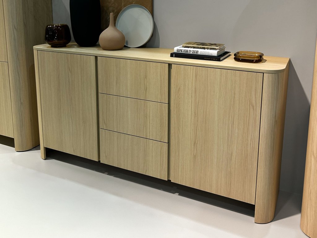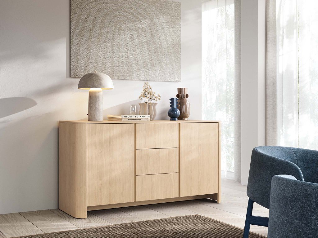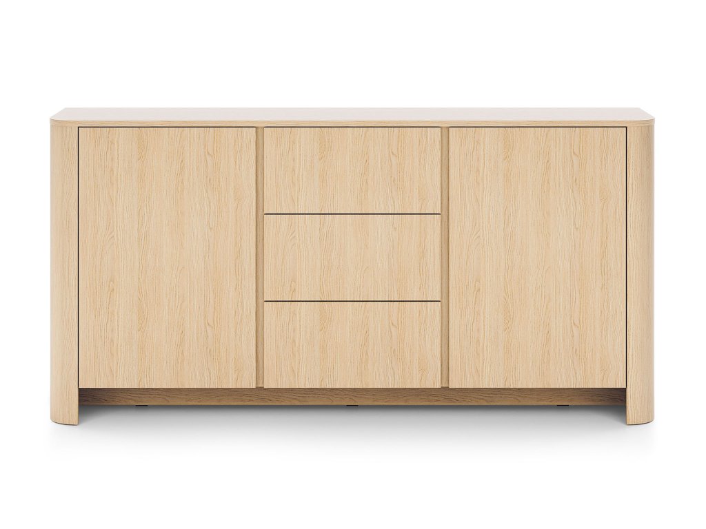 Egy praktikus és stílusos kiegészítőt keres a nappaliba vagy a hálószobába. A széles BORI komód vicenza tölgy színben elegánsan egészíti ki a szobát, miközben nagy méretű tárolóhelyet kínál. Középen három fiók található, amelyek ideálisak apróbb tárgyak vagy textíliák számára, két oldalában pedig egy-egy ajtós szekrény kapott helyet. A modern megjelenést a fogantyú nélküli push-to-open nyitórendszer és a finoman lekerekített élek teszik teljessé.