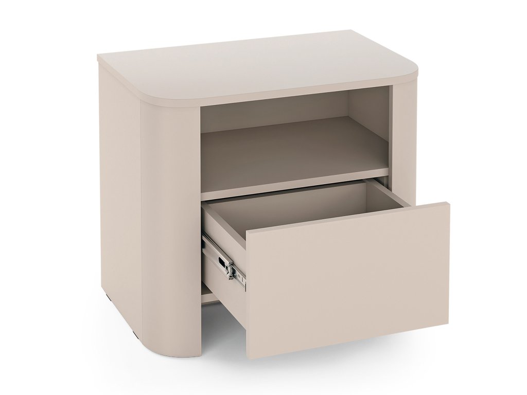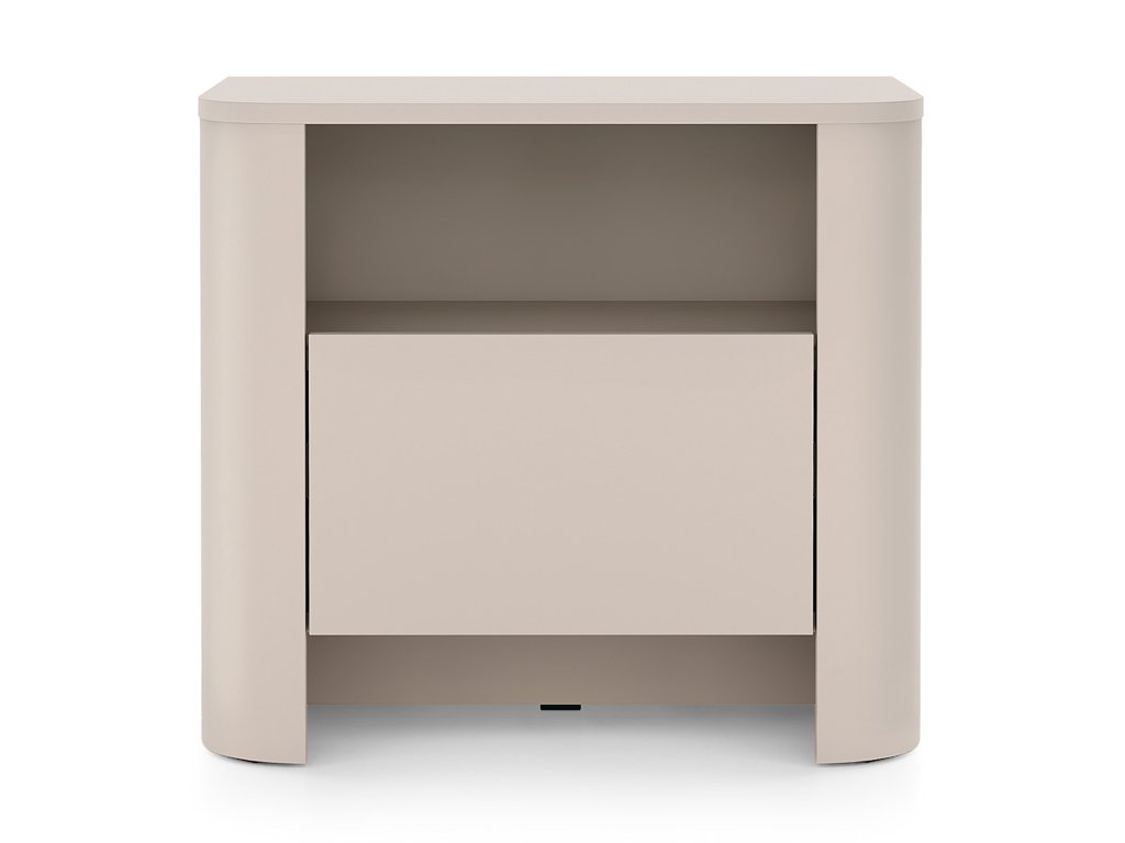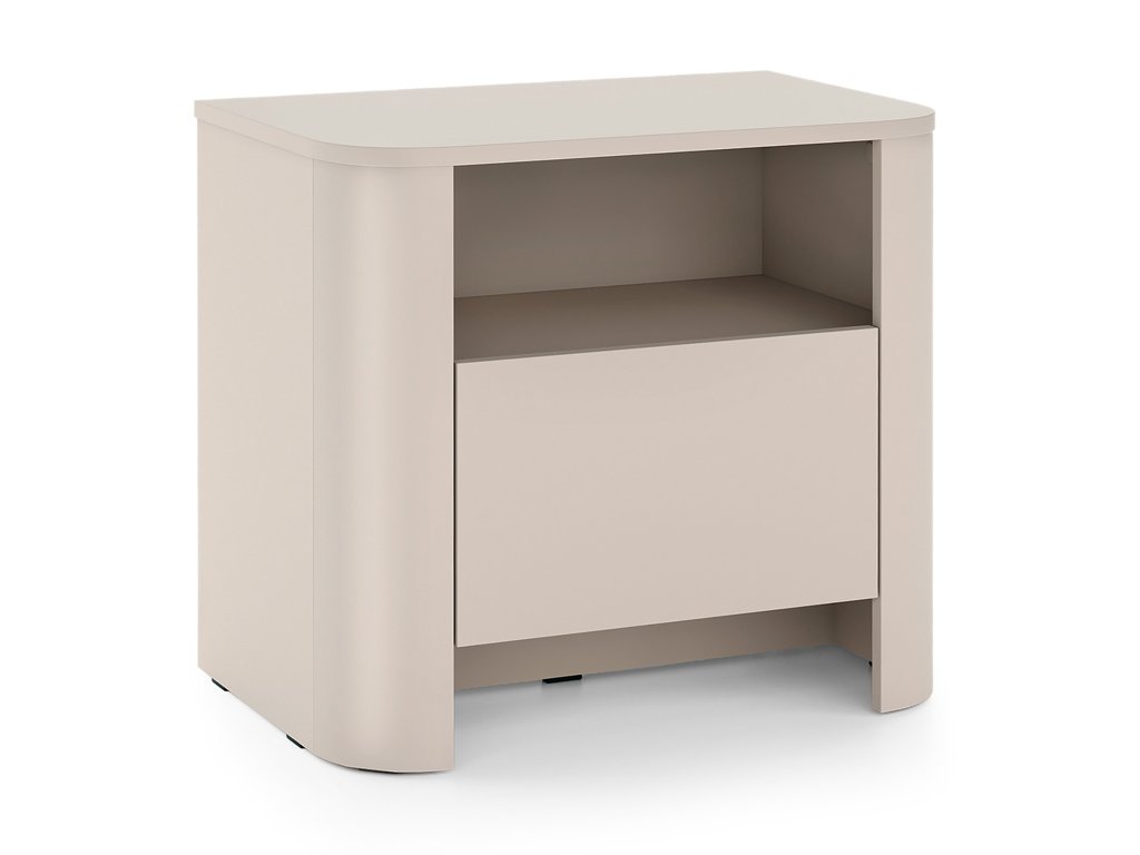 A kasmír színű BORI éjjeliszekrény stílust és funkcionalitást visz a hálószobába. Egy praktikus fiókkal rendelkezik a kisebb tárgyak számára, a felette található nyitott polc pedig ideális könyvek, dekorációk vagy személyes dolgok tárolására, amelyeket szeretne a közelben tudni. A modern lekerekített élek és a letisztult dizájn, valamint a finom ívek harmonikusan illeszkednek a kollekció többi eleméhez.