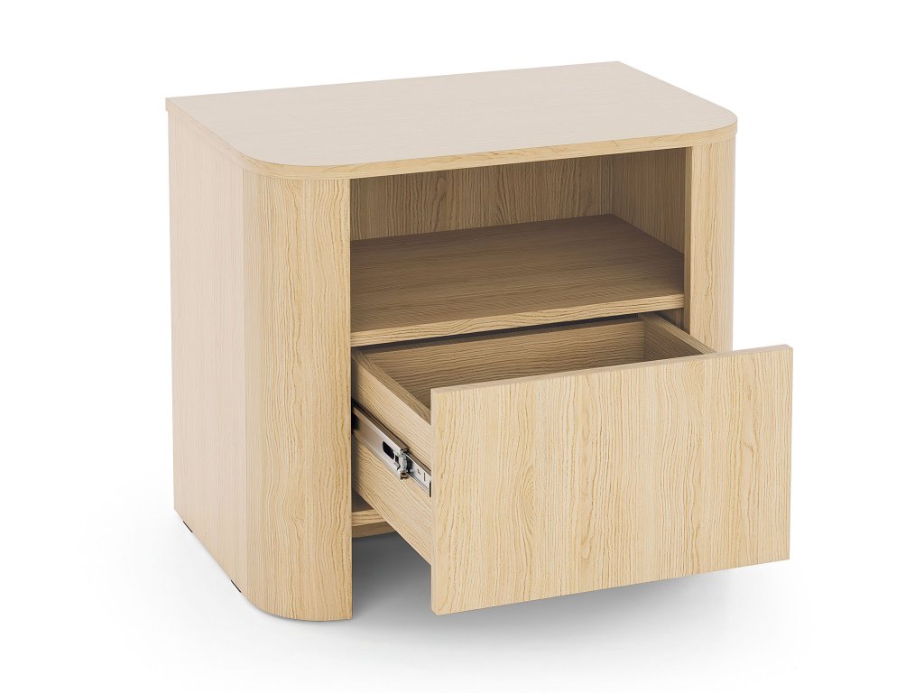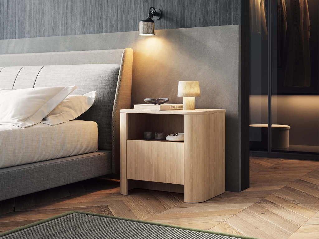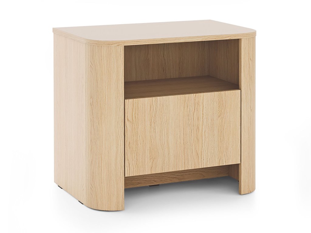 A BORI éjjeliszekrény modern vicenza tölgy színben készült, amely meleg hangulatot teremt minden hálószobában. Egy praktikus fiókkal rendelkezik a kisebb tárgyak számára, a felette található nyitott polc pedig ideális könyvek, dekorációk vagy személyes dolgok tárolására, amelyeket szeretne a közelben tudni. A modern lekerekített élek és a letisztult dizájn, valamint a finom ívek harmonikusan illeszkednek a kollekció többi eleméhez.