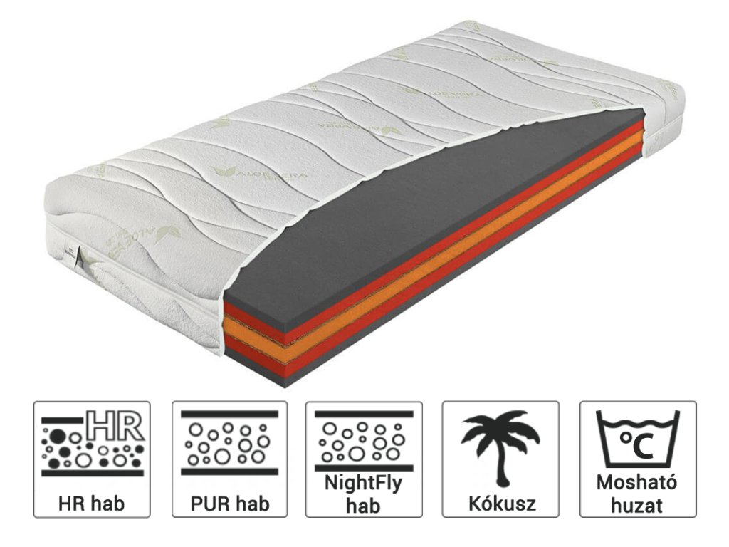 Anyagösszetétel: PUR hab, NightFly hab, kókuszréteg, hideg HR hab, Huzat