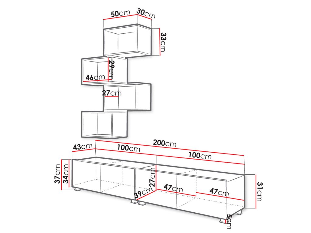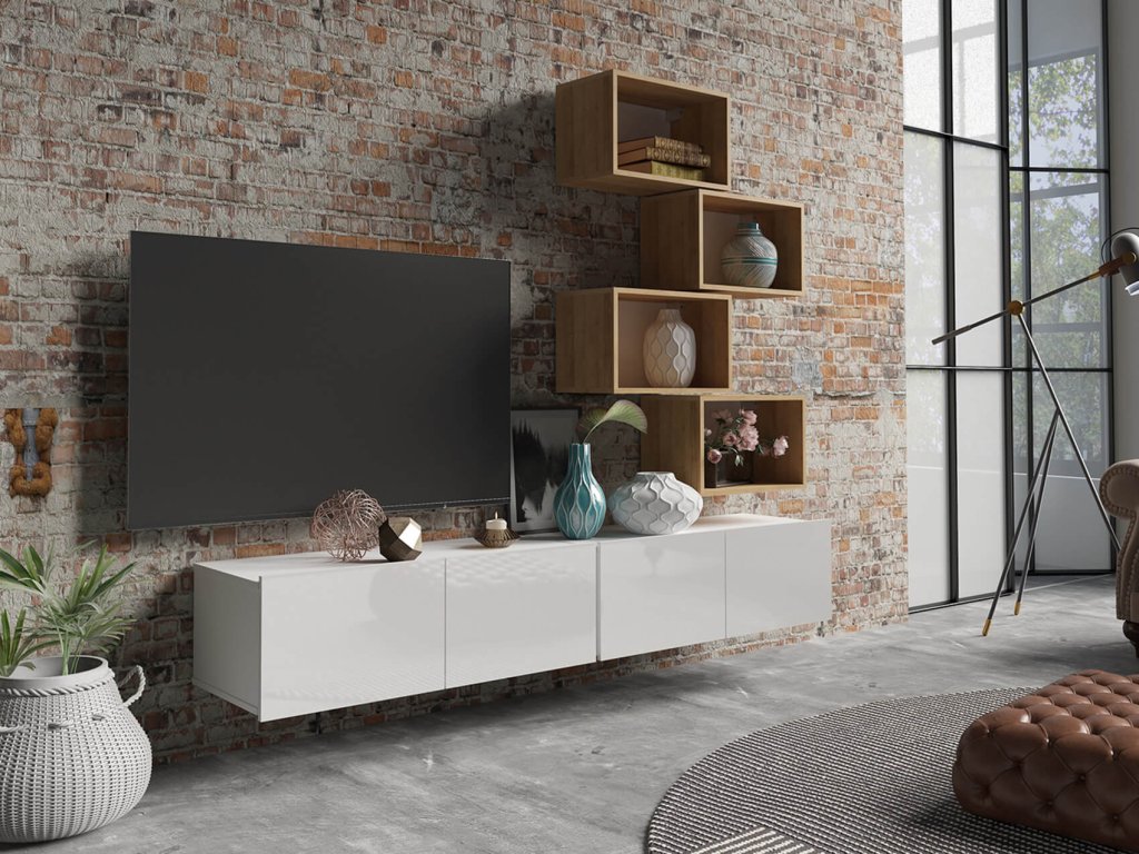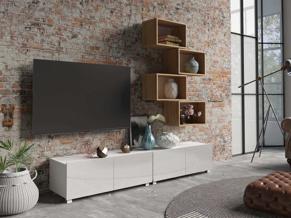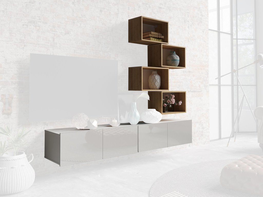A CALABRINI V nappali bútor összeállítás hat bútor elemből áll: 2x tévés szekrény, 4x nyitott fali polc