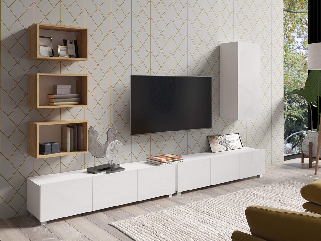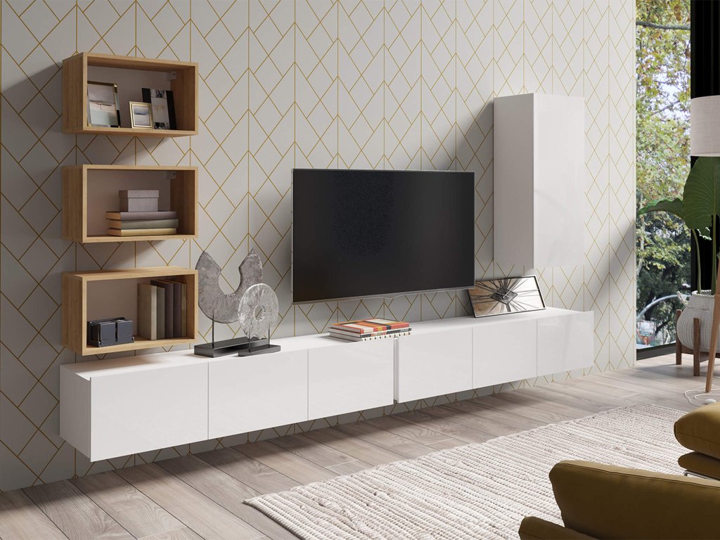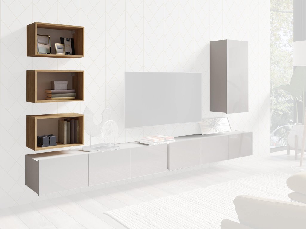 A CALABRINI IV nappali bútor összeállítás hat bútor elemből áll: 2x tévé állvány, 3x nyitott fali polc és 1x fali függő szekrény