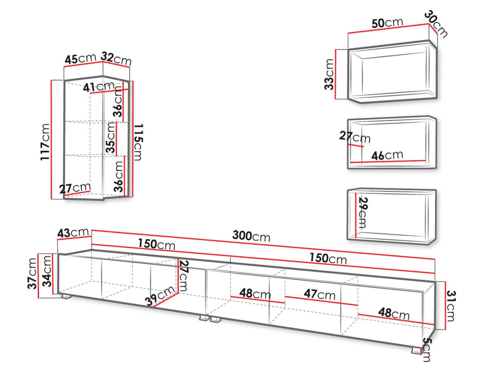 - Calabrini 150 tévés szekrény - három kis szekrényből álló tv-állvány műanyag lábakkal. A tévés szekrény a falra is szerelhető. Méret (SzéxMaxMé): 150 x 37 x 43 cm. (150 x 34 x 43 cm lábak nélkül)