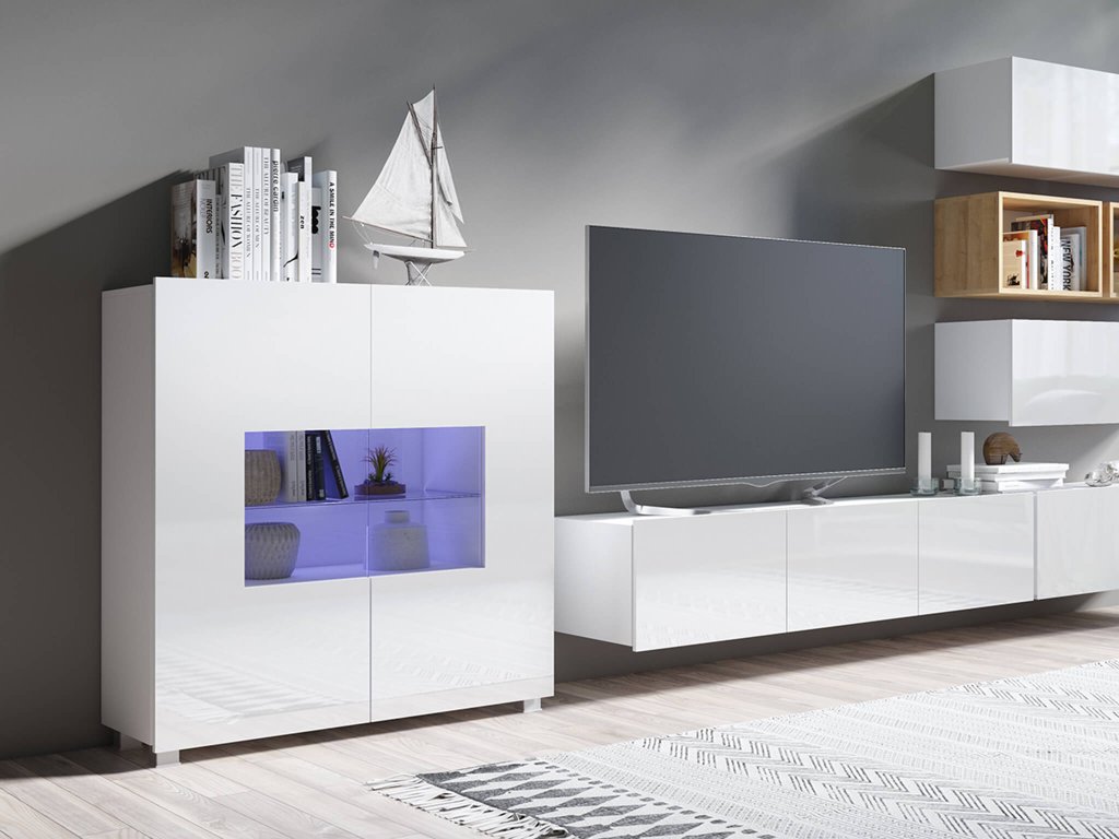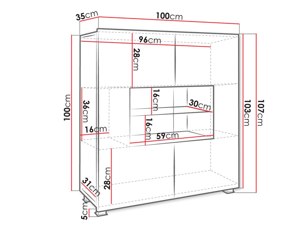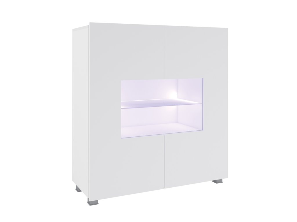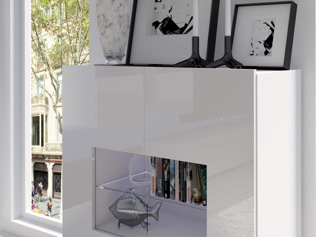 A Calabrini vitrines fehér komód számos tároló helyet kínál. A különleges komód polcokkal rendelkezik, a középső része pedig üveges. Az üveges rész mögött üveges polcot helyeztek el, amely tökéletes helyet kínál a dísztárgyainak. Ez az üveges rész igazán elegánssá teszi az egész vitrint. A komód ezüst színű műanyag lábakkal rendelkezik, amelyek biztosítják a stabilitását és a szofisztikált kinézetét. Ideális választás mindazoknak, akik értékelik a stílust, a praktikumot és a minőséget.