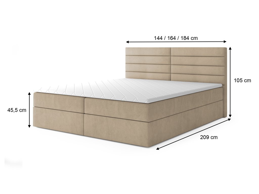 A bézs színű CARGO boxspring ágy az elegancia és a modern design kombinációja. Tömör fából készült szerkezettel rendelkezik, amely rendkívüli stabilitást és ellenálló képességet biztosít. Az ágyhoz tartozó rugós matrac 14 cm magas Bonell rugókkal van ellátva. Közepes keménységgel rendelkezik és tökéletes kényelmet biztosít. A kontinentális ágy kárpitozott ágytámlával díszített, amely T25-ös habbal rendelkezik, így biztosítva a kényelmét tévénézés vagy könyvolvasás közben. A franciaágy praktikus ágyneműtartóval is el van látva automata nyitási rendszerrel, ahová elhelyezheti az ágyneműt, párnákat vagy a szezonális ruhákat. Mindazok számára ajánljuk, akik egy praktikus, mégis stílusos ágyat keresnek a hálószobájukba.