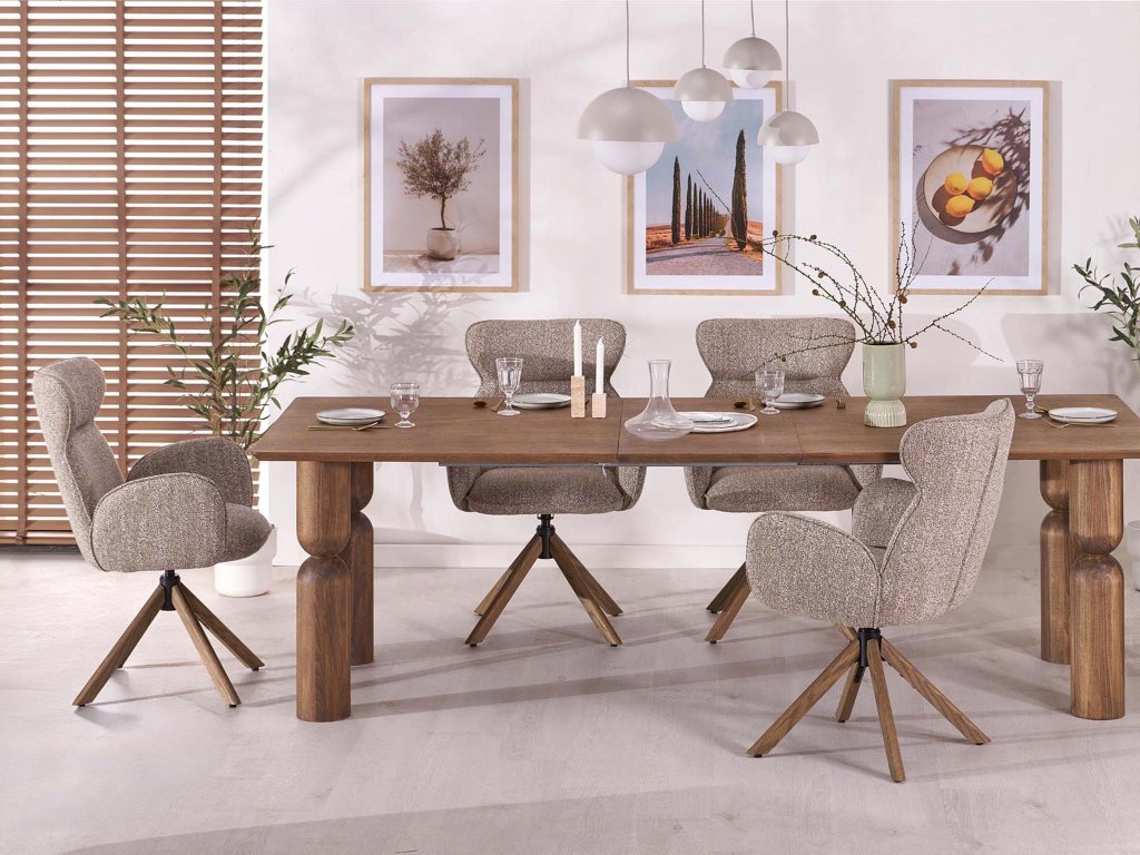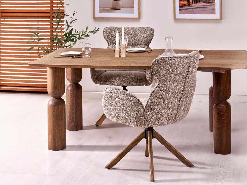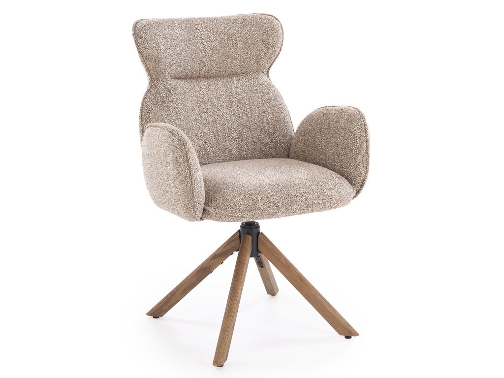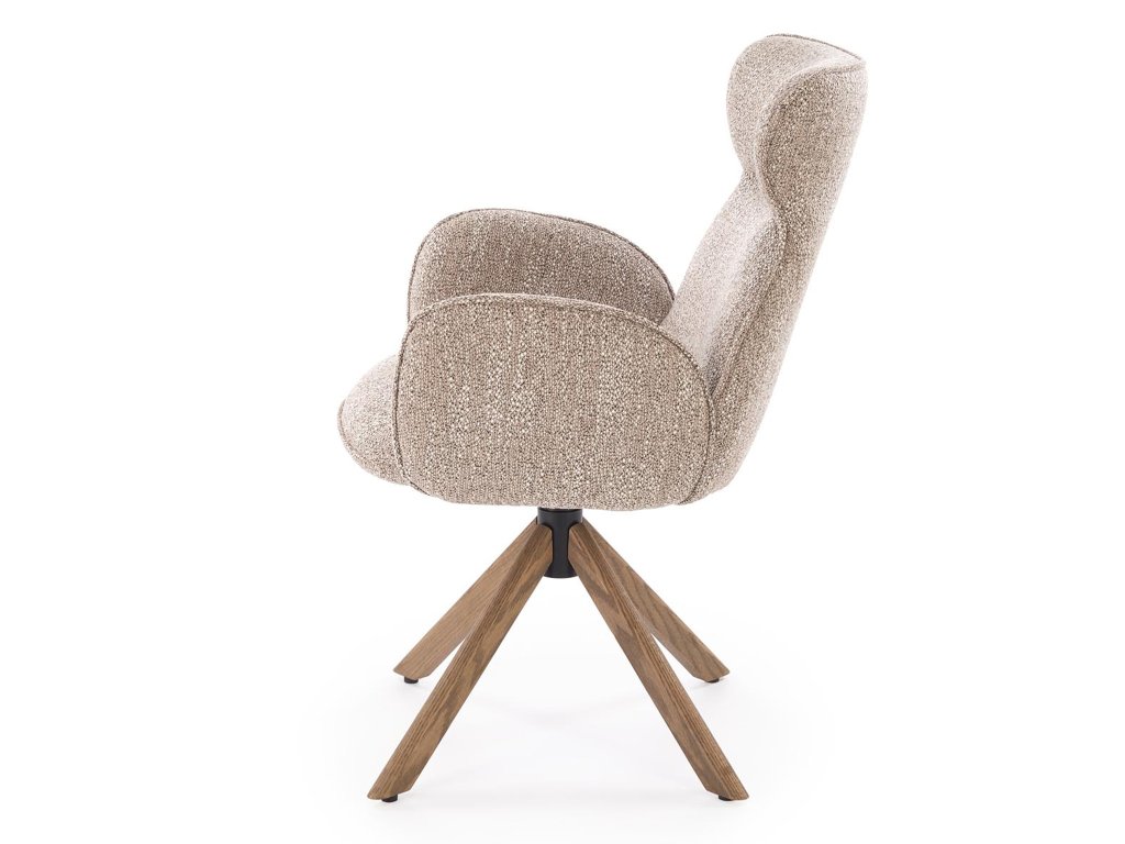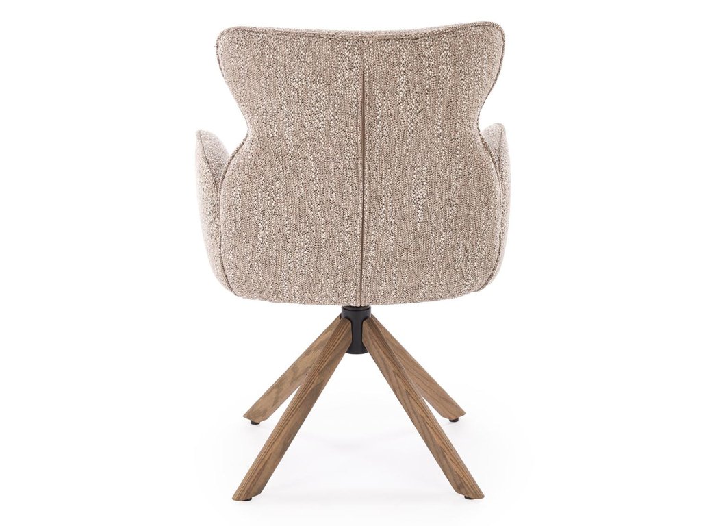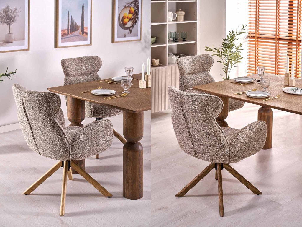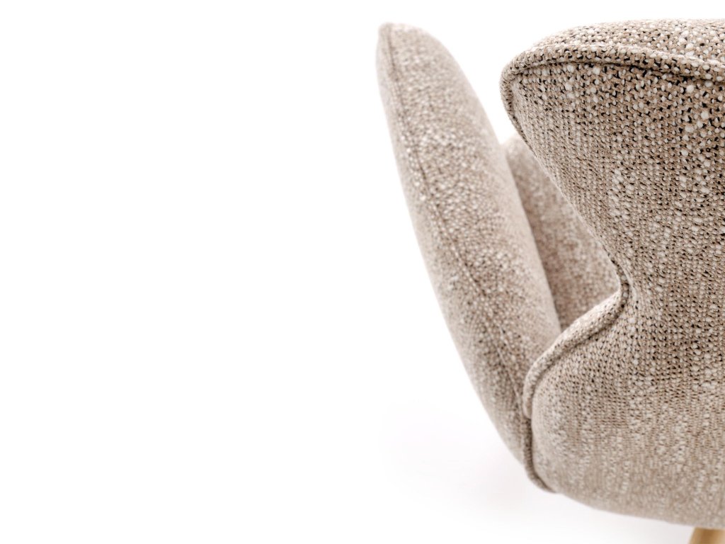 A Carla K585 egy forgó fotel, amely már első pillantásra magára vonja a figyelmet elegáns formáival, meleg bézs szövetével és diószínű fa lábaival. Dizájnja modern, de enyhe retro hangulattal rendelkezik, így különböző berendezési stílusokhoz illik – a természetes skandinávtól az időtlen vintage-ig.