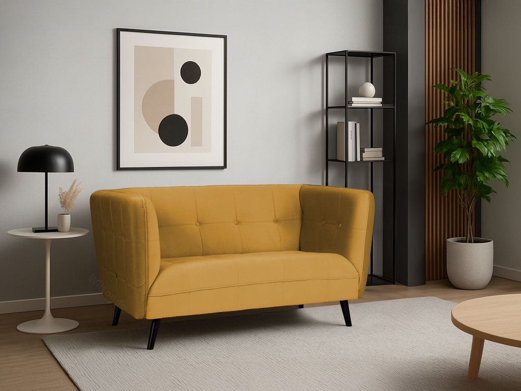 CASTELLO II mustársárga steppelt, kárpitozott kanapé, amely egy első látásra feltűnő bútor darab. A kétszemélyes kanapé tökéletes választás a nappaliba, de akár az irodába, kávézóba vagy üzlethelységbe is választható. A kinézetének köszönhetően megfelelő választás a skandináv, a modern és a retro stílusban berendezett helységekbe. Az érdekes dizájn és a gyönyörű bársonyos anyag igazán lenyűgöző darabbá varázsolják, amely feltűnést kelt majd minden otthonban.A kanapé tömör fából készült lábakon áll elegáns fekete színben.