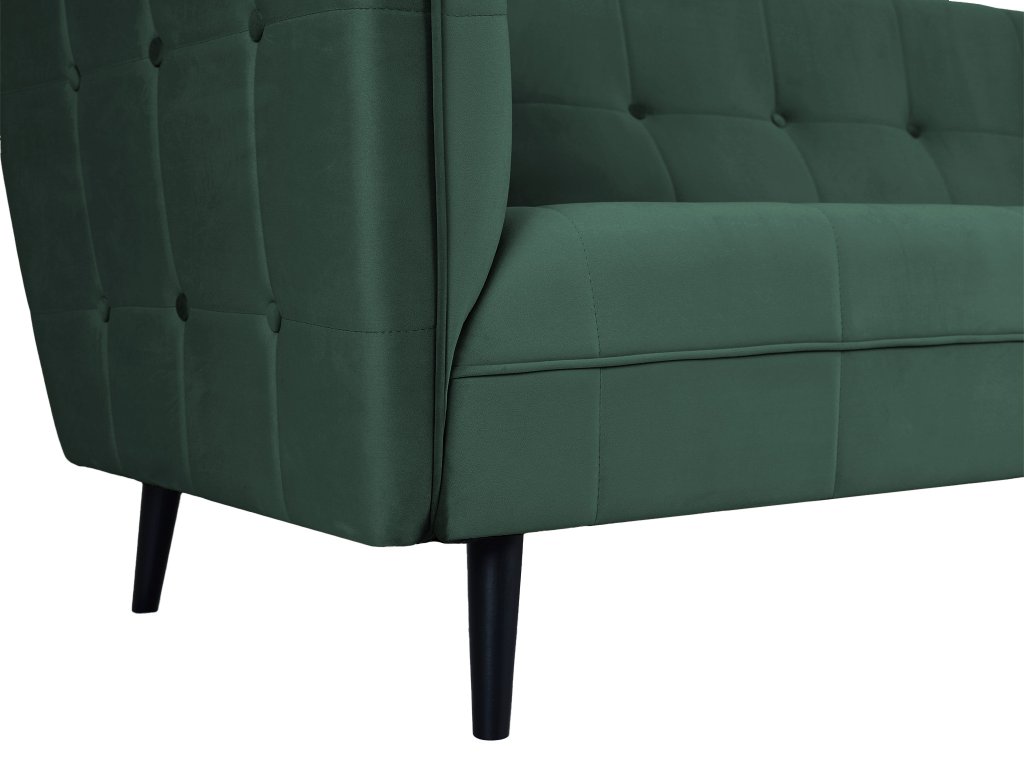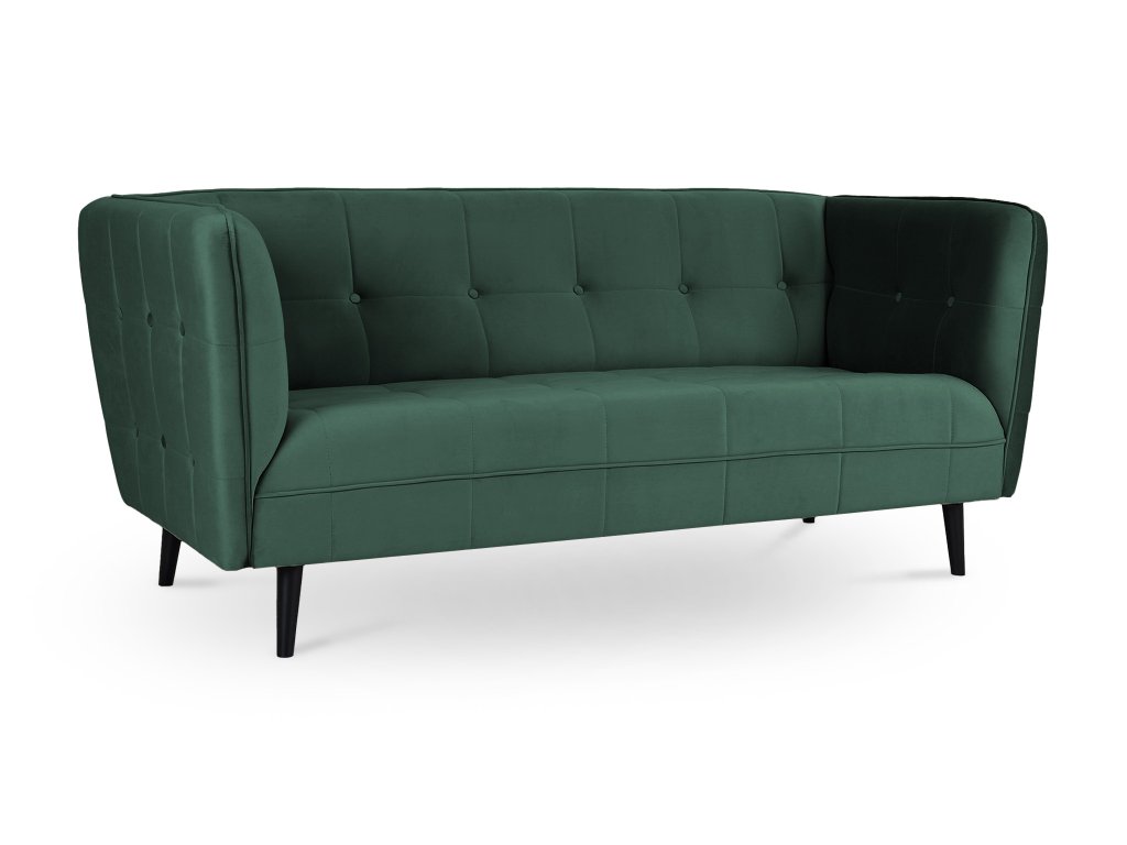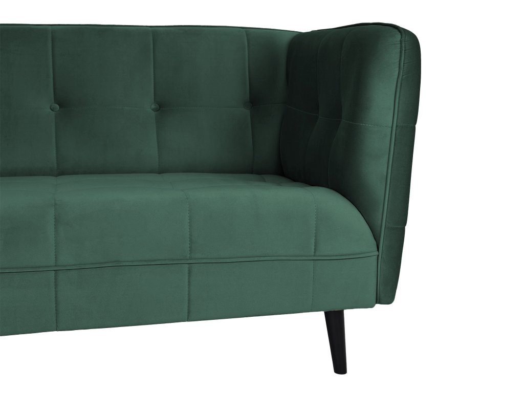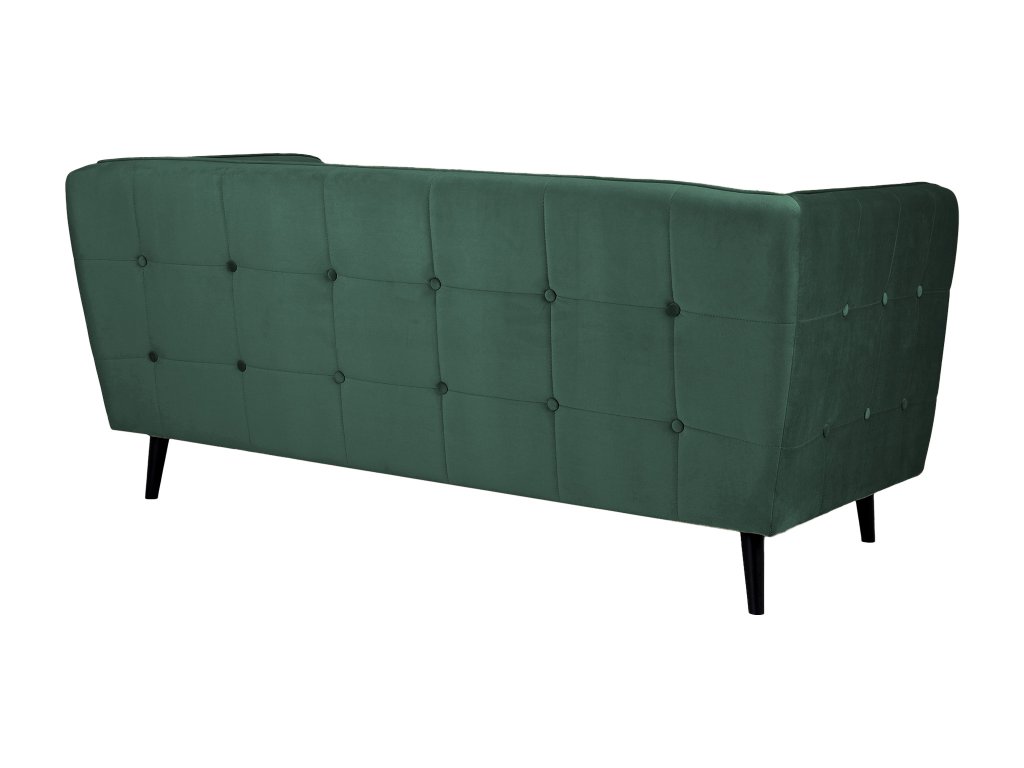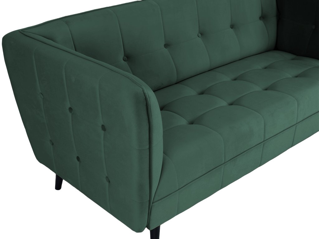Castello III gyönyörű, modern, skandináv stílusú háromszemélyes kanapé sötétzöld színben. Az érdekes dizájn és a gyönyörű bársonyos anyag igazán lenyűgöző darabbá varázsolják a kanapét, amely feltűnést kelt majd minden otthonban. Tökéletes választás a nappaliba, de akár az irodába, kávézóba vagy üzlethelységbe is választható. A kanapé tömör fából készült lábakon áll elegáns fekete színben. Első látásra beleszeret majd ebbe a modern zöld kanapéba.