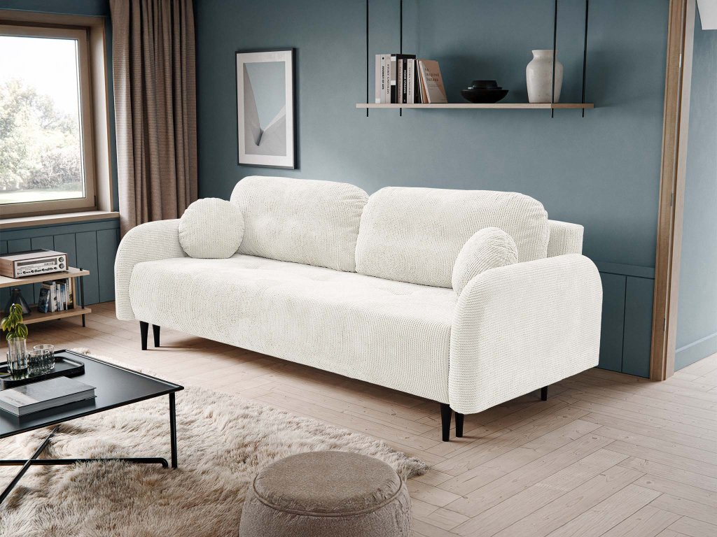 A CLOUD krémszínű ágyazható kanapé tökéletes választás mindazoknak, akik az elegáns és praktikus bútorok kedvelői. Lekerekített formái, puha felületei és a strukturált szövet, amellyel kárpitozva van igazán lenyűgöző összhatást keltenek. A díszpárnák és a kontrasztos fekete tömörfa lábak biztosítják a gyönyörű megjelenését.