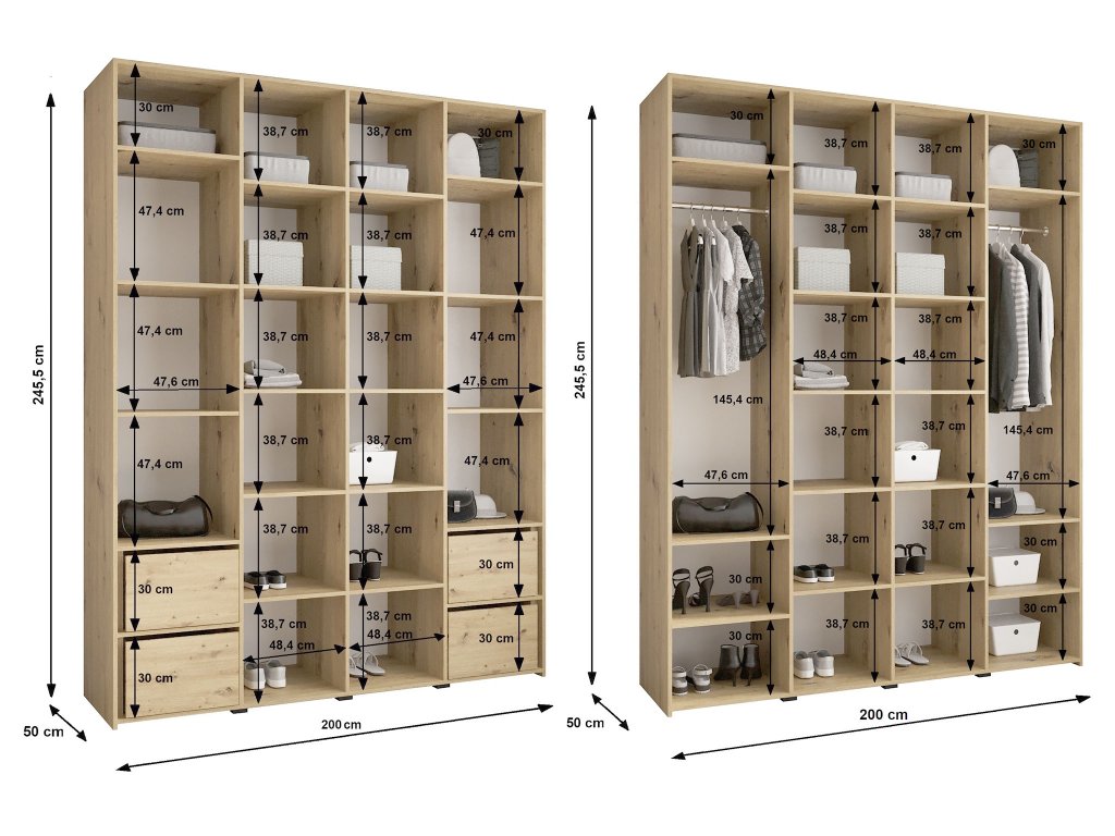 A szekrény belsejében erős fém akasztórúd található ruhák és kabátok számára, valamint polcok a rendszerezett és praktikus tárolás érdekében. A kifelé nyíló ajtók a jól ismert Hettich márkától származó halk záródó rendszerrel vannak felszerelve, ami még kényelmesebbé teszi a mindennapi használatot.