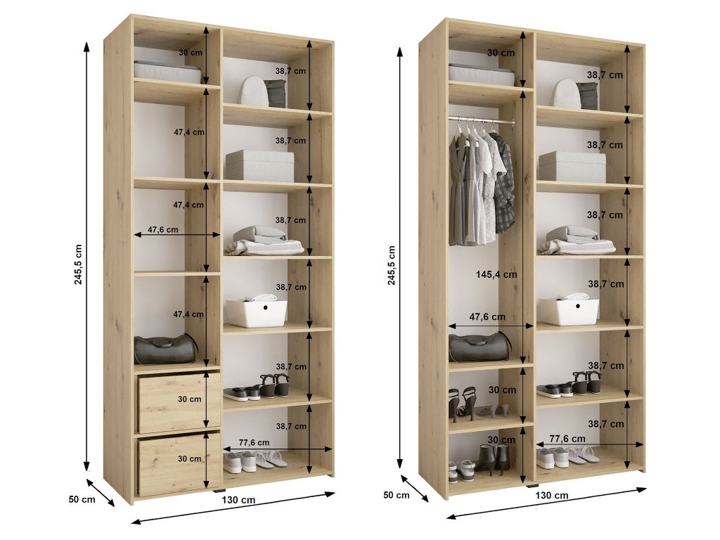 A szekrény belsejében erős fém akasztórúd található ruhák és kabátok számára, valamint polcok a rendszerezett és praktikus tárolás érdekében. A kifelé nyíló ajtók a jól ismert Hettich márkától származó halk záródó rendszerrel vannak felszerelve, ami még kényelmesebbé teszi a mindennapi használatot.