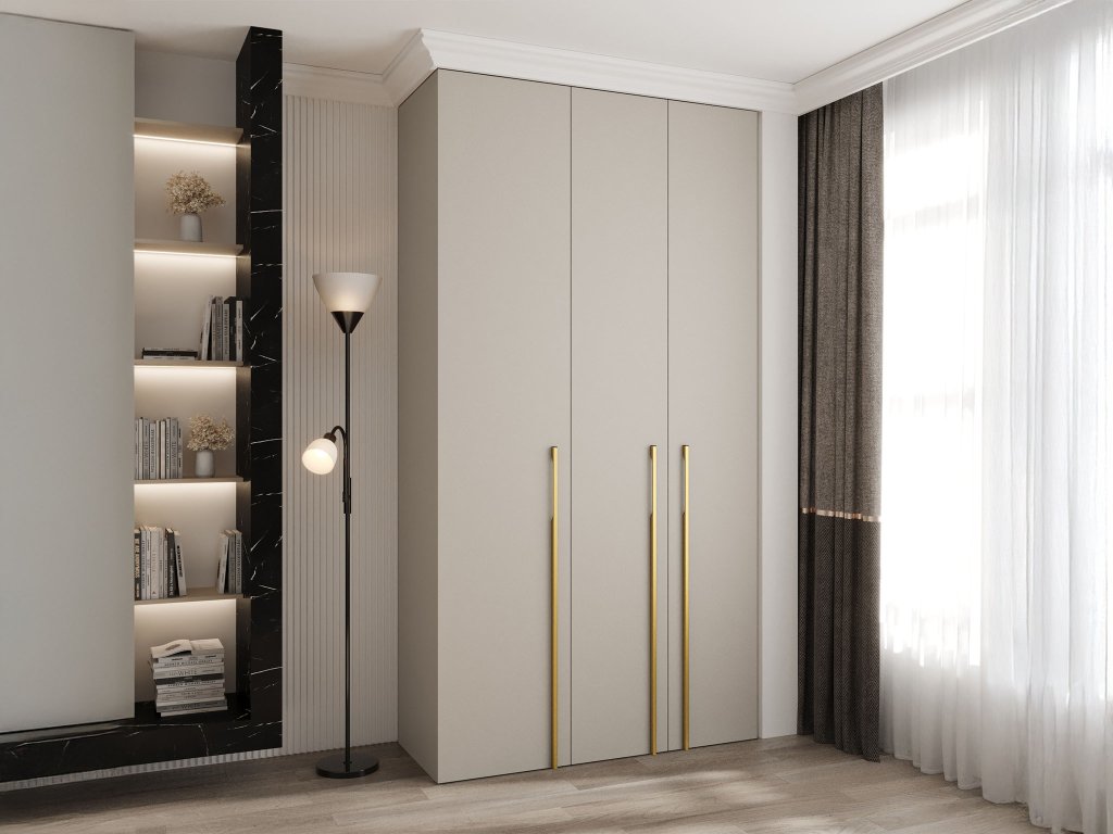 Minimalista stílusú Como 3 kétajtós szekrény kasmír színben arany színű fogantyúkkal