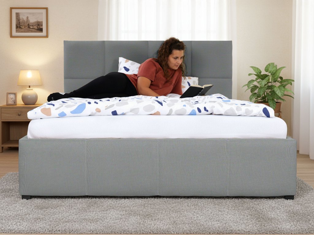 A puha, kellemes tapintású kárpitozás minden érintésnél kényelmet nyújt, míg a magas fejvég praktikus támaszt biztosít olvasáshoz vagy esti pihenéshez. Az ágy tágas tárolóhelyet rejt, amely könnyen hozzáférhető a fém rácsos emelőmechanizmus révén – tökéletes ágynemű vagy szezonális holmik tárolására.
