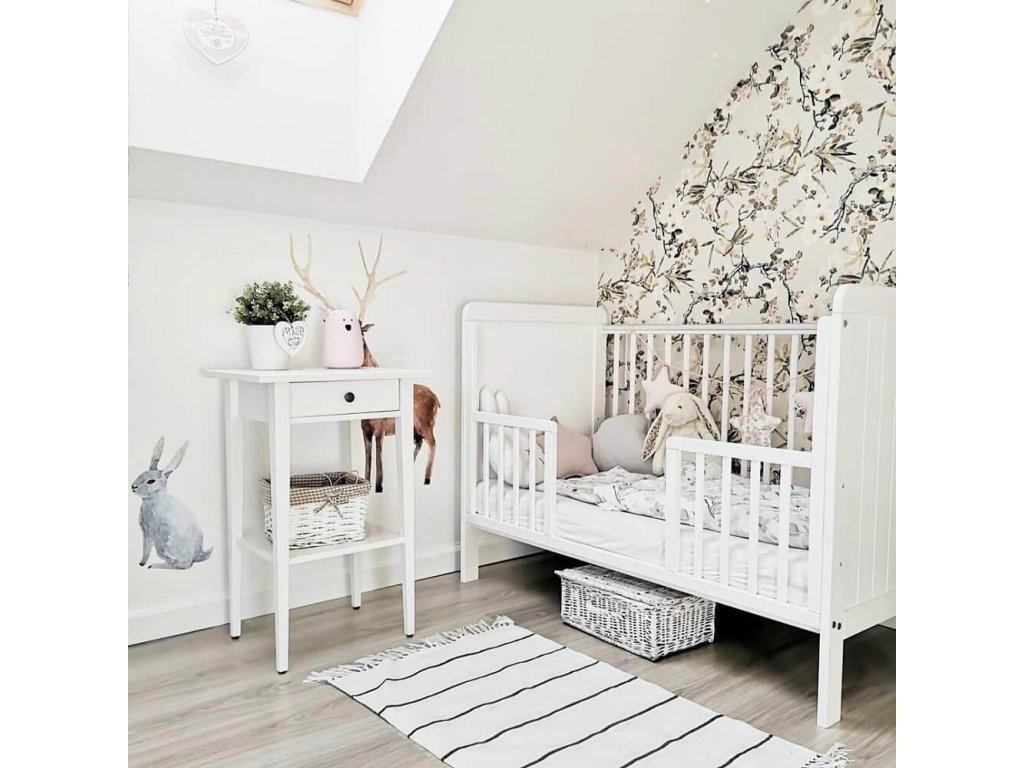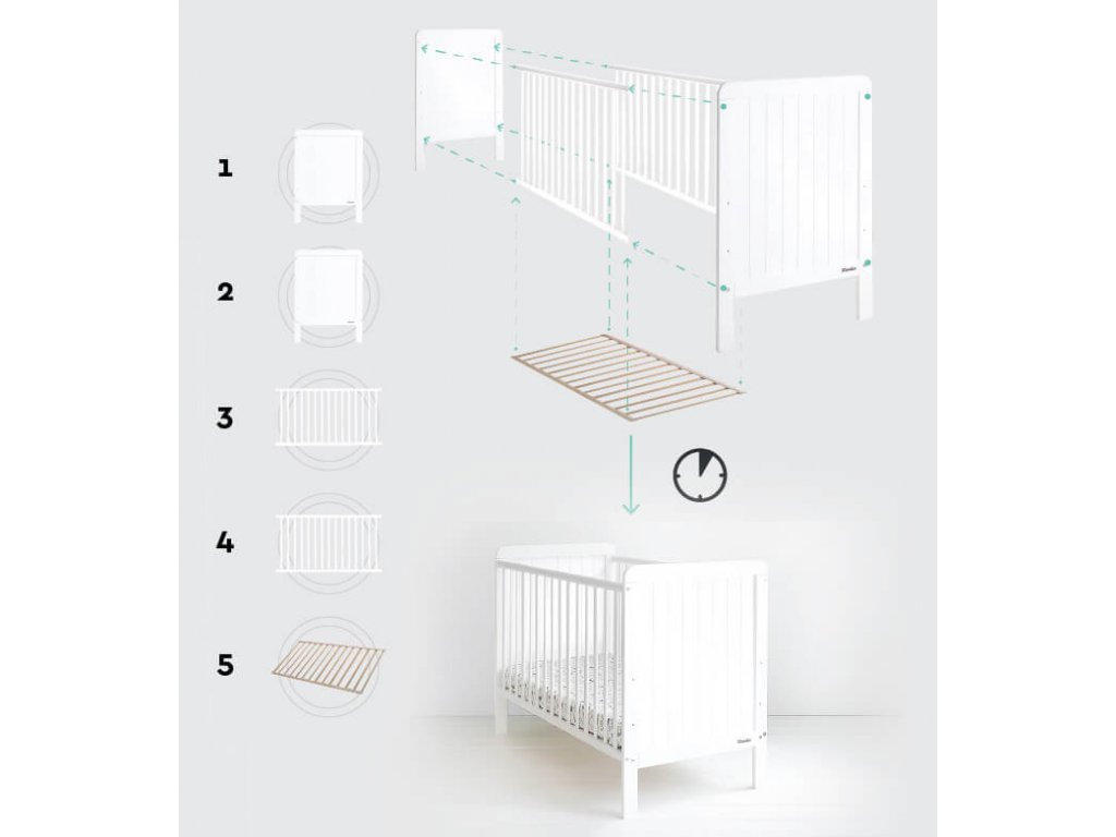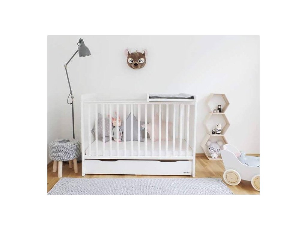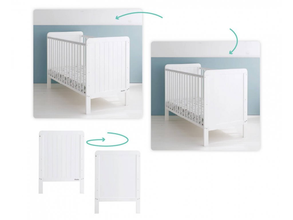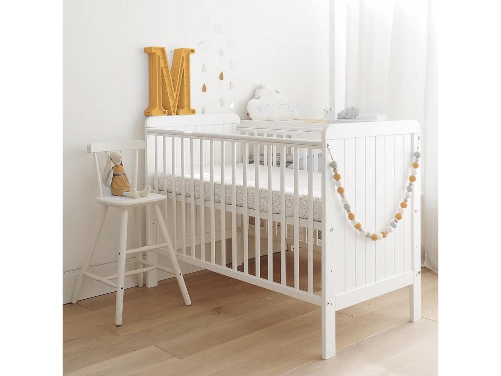 A COUNTRY Cot kiságy 60x120 cm minőségi tömör boroviból és MDF-ből készül. A babaágy két réteg minőségi tanúsítvánnyal rendelkező fehér félig matt festékkel van bevonva a háttámláin pedig függőleges csíkok találhatók. A kiságy fekhelyének magassága három fokozatban állítható, három kivehető ráccsal rendelkezik. A felső oldalsó lécek "rágókákkal" védettek, melyek megóvják gyermekét attól, hogy esetleg lerágja a festéket. Az összeszerelése rendkívül egyszerű.