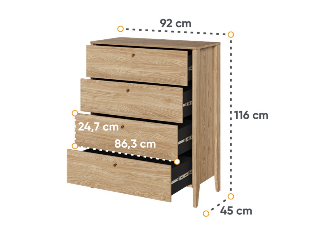 A COZY CZ-03 négyfiókos komód elegáns és praktikus kiegészítője lehet a modern otthonoknak. Minimalista kialakítása és natúr tölgy színe harmonikus megjelenést kölcsönöz a szobának. A fából készült komód négy tágas fiókkal rendelkezik, amelyek elegendő tárolóhelyet biztosítanak a ruhák, a kiegészítők vagy egyéb apróságok tárolására. A finom, kis fém fogantyúk letisztult és kifinomult megjelenést kölcsönöznek a komódnak, míg a felhasznált anyagoknak köszönhetően egy strapabíró és könnyen karbantartható bútort kap, ami a mindennapi használat során is nagy előnyt jelent. A Cozy hálószobai komód tökéletes választás mindazok számára, akik a praktikus és a modern komódot keresnek az otthonukba.
