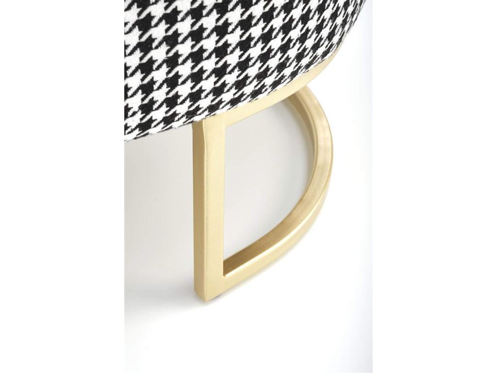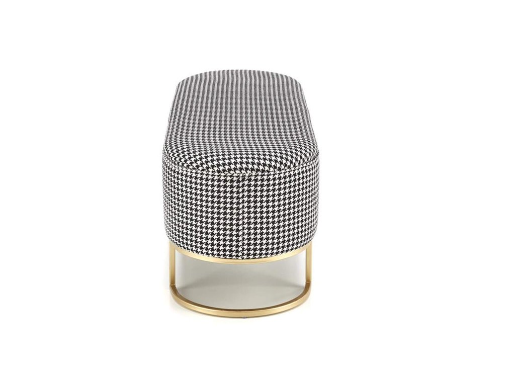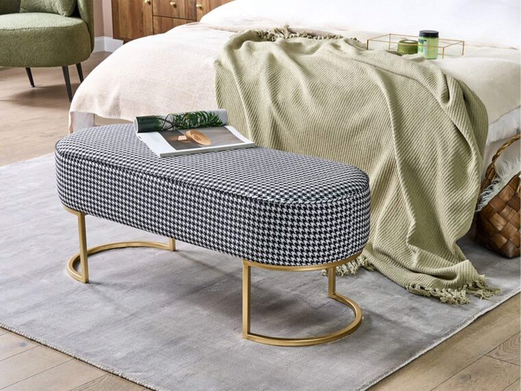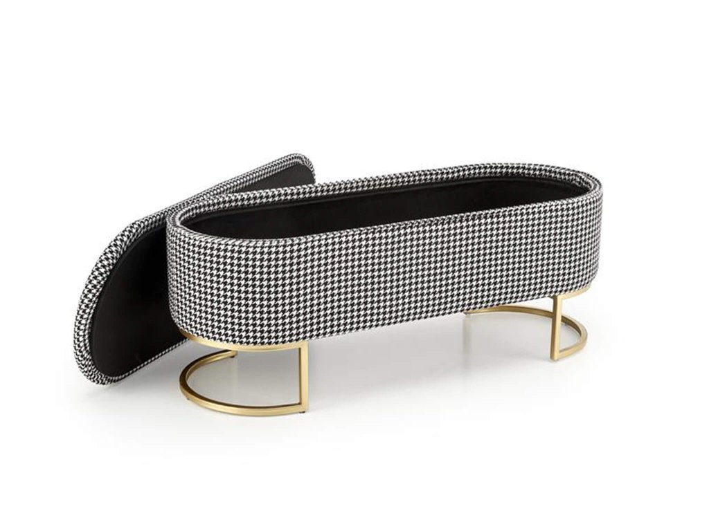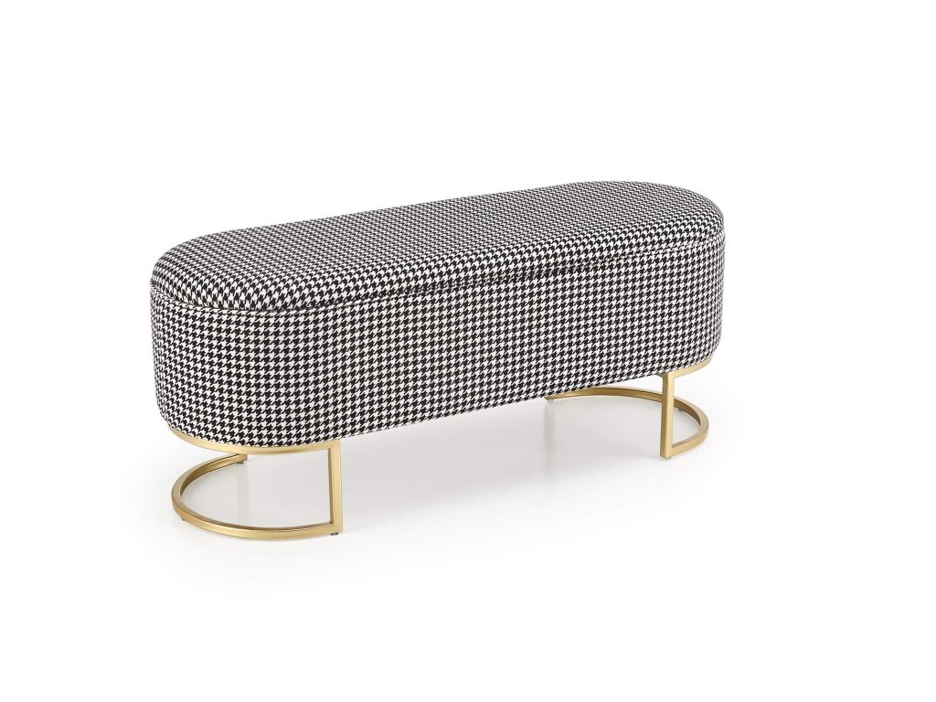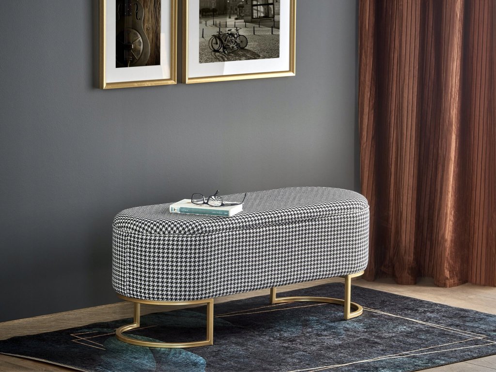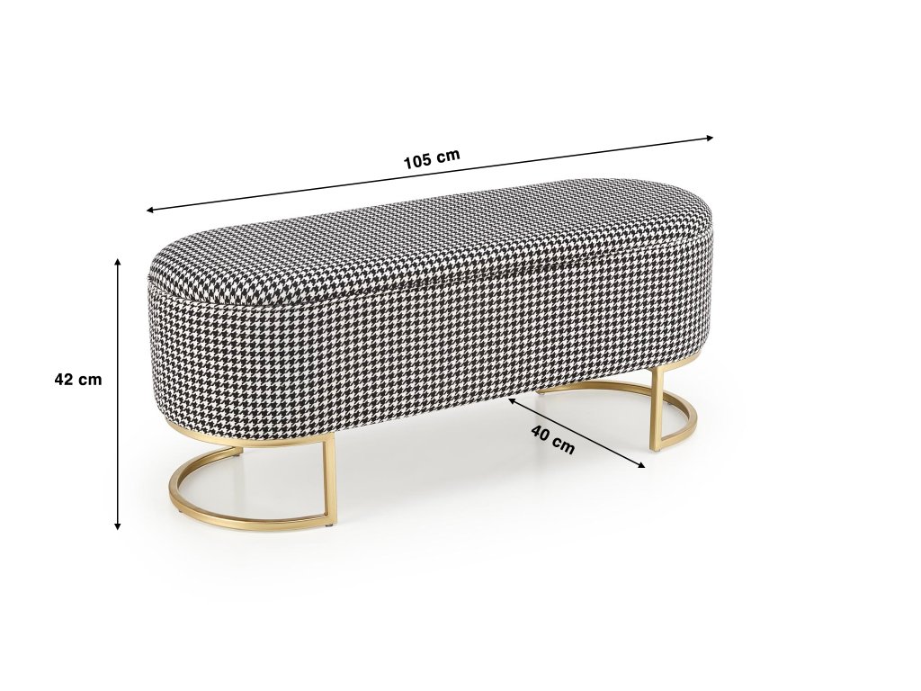 Kárpitozott elegáns DALMA tárolós pad, amely tökéletes választást jelent a hálószobába, az előszobába vagy a nappaliba. Nem mindennapi stílussal rendelkezik és egy kisebb tároló hellyel. Elhelyezheti bele a plédeket, párnákat vagy egyéb apróbb dolgokat. A pad 105 cm széles, amely ideális választást jelent akár a franciaágy végébe is. Az egész pad houndstooth azaz tyúkláb mintás szövettel kárpitozott. A szerkezete acélból készült arany színű porszórt festéssel. A Dalma ülőpad tökéletes párost alkot az ARUNA puffal.