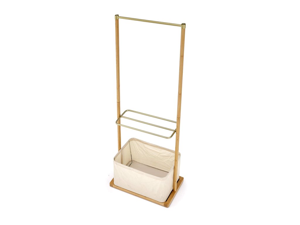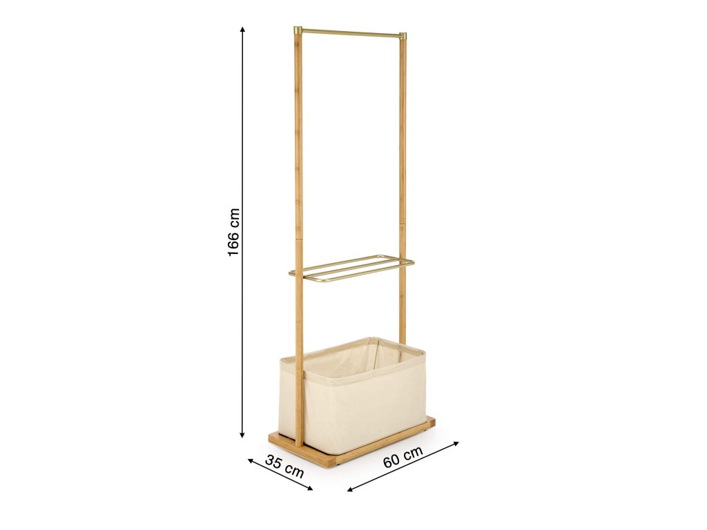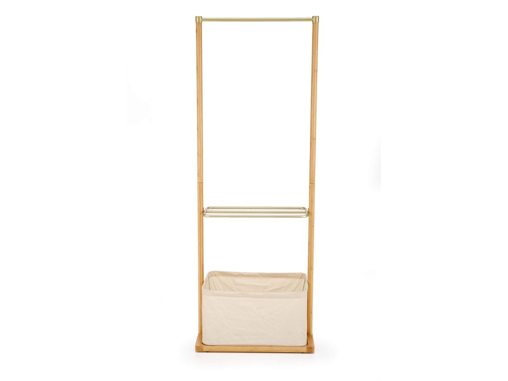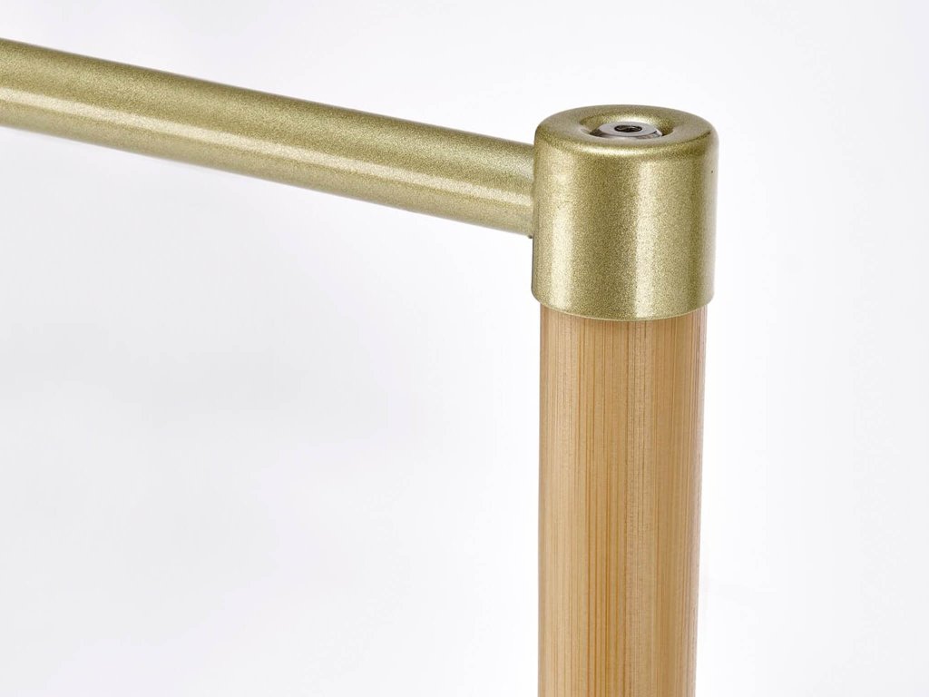A DASIA WU31 bambusz ruhaállvány ideális kiegészítője lehet az Ön ruhatárának. Ez a ruhatartó állvány nemcsak funkcionális, hanem elegáns is köszönhetően natúr színének és az arany kiegészítőknek. A váz tartós bambuszfából készült, ami biztosítja a szilárdságot és időtállóságot. Egy kosárral is rendelkezik a sapkák és sálak számára, hogy mindig kéznél legyenek a szükséges kiegészítők. A ruhatartó felső része krómacélból készült, ami kellő teherbírást biztosít a ruhák számára. A ruhaállvány megjelenésében ötvöződik a bambusz természetes szépsége a modern arany kiegészítőkkel, ezáltal designos és praktikus bútordarabbá válik a belső térben. Dekoratív elemként bájt és eleganciát kölcsönöz otthonának.