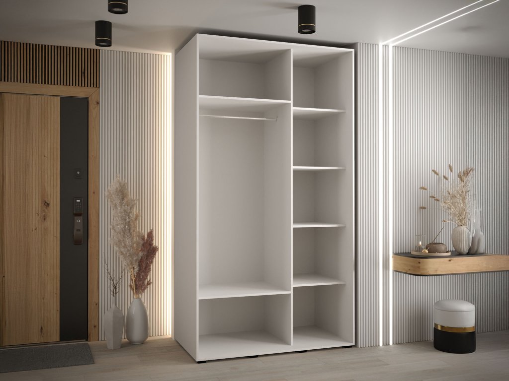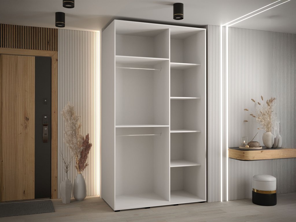 A fehér Davos 1 ruhásszekrény a minimalista dizájn és a praktikum tökéletes kombinációja, amely bármely helyiségben megállja a helyét. Fehér tolóajtói, fekete dekorációs lécekkel és fogantyúkkal kiegészítve, stílust és eleganciát kölcsönöznek minden modern otthonnak. Ez a 140 cm széles polcos szekrény ideális választás a hálószoba, előszoba vagy nappali rendezetté tételére.