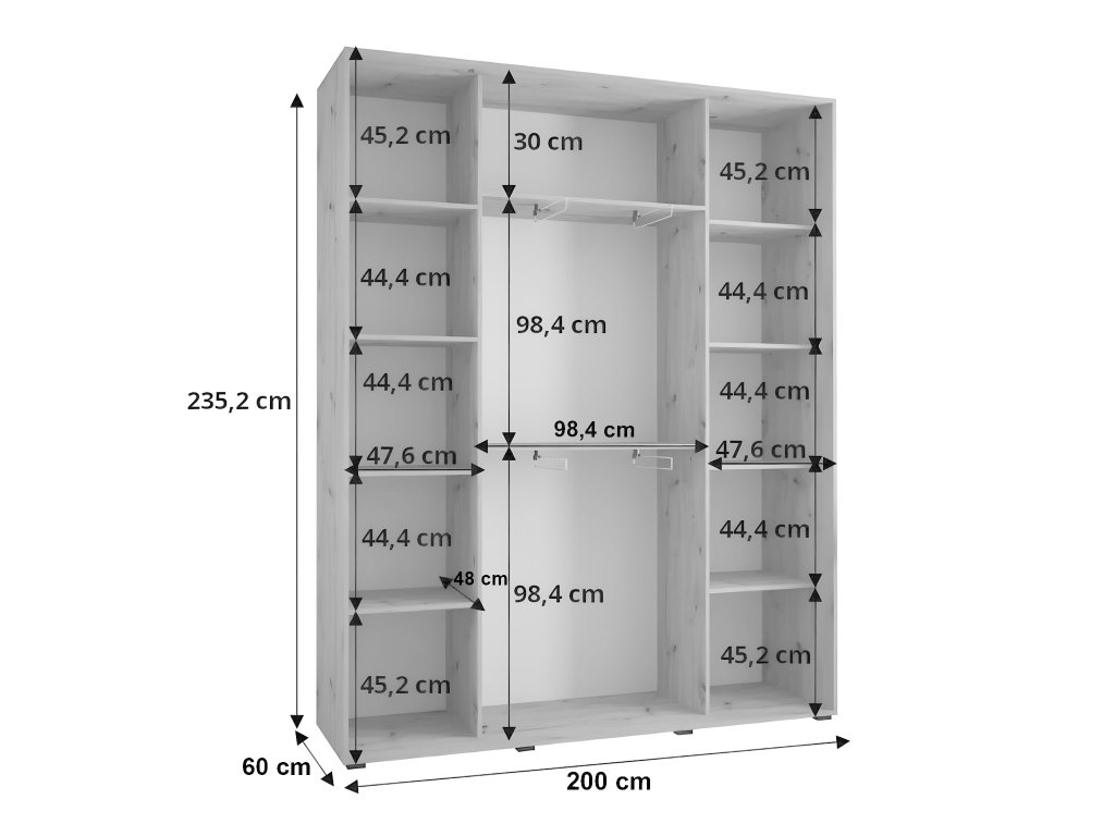 A belső elrendezést a tér maximális kihasználására tervezték. A szekrény középső részében két fém rúd található, amelyek rugalmasan elhelyezhetők az Ön igényei szerint. Ez a kialakítás elegendő helyet biztosít a ruhák felakasztására, még a hosszabb darabok esetében is. E rudak felett egy széles polc található, amely ideális kalapok, sálak vagy egyéb kiegészítők tárolására. A szekrény oldalain négy polc helyezkedik el, amelyek további tárolóhelyet biztosítanak cipők, táskák vagy más személyes tárgyak számára. Ez a szekrény kiváló választás azoknak, akik ötvözni szeretnék a szép dizájnt a praktikussággal, és tágas, hatékony elrendezésre van szükségük otthonukban.