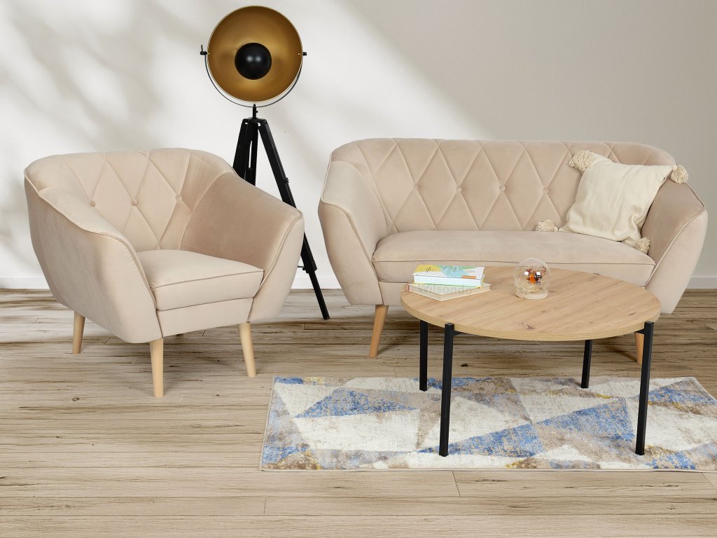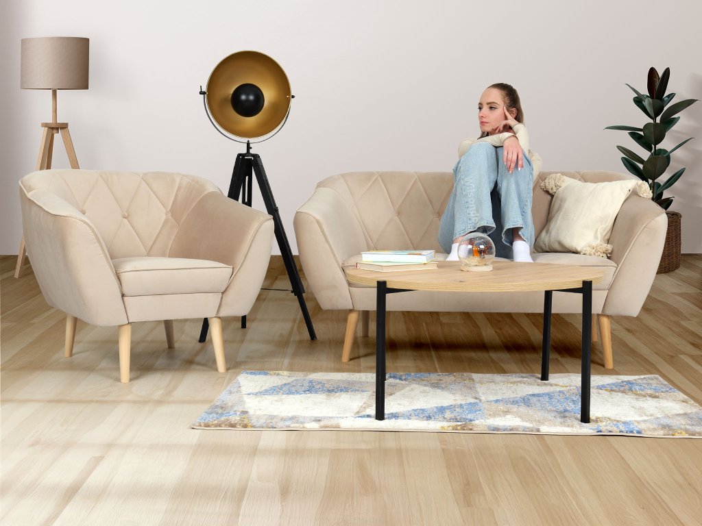 A bézs színe eleganciát visz a szobába és otthonos légkört teremt. A teljes garnitúra natúr színű stabil tömör fa lábakon áll, amelyek kiemelik a skandináv designt, és biztosítják a bútor strapabírását és stabilitását.