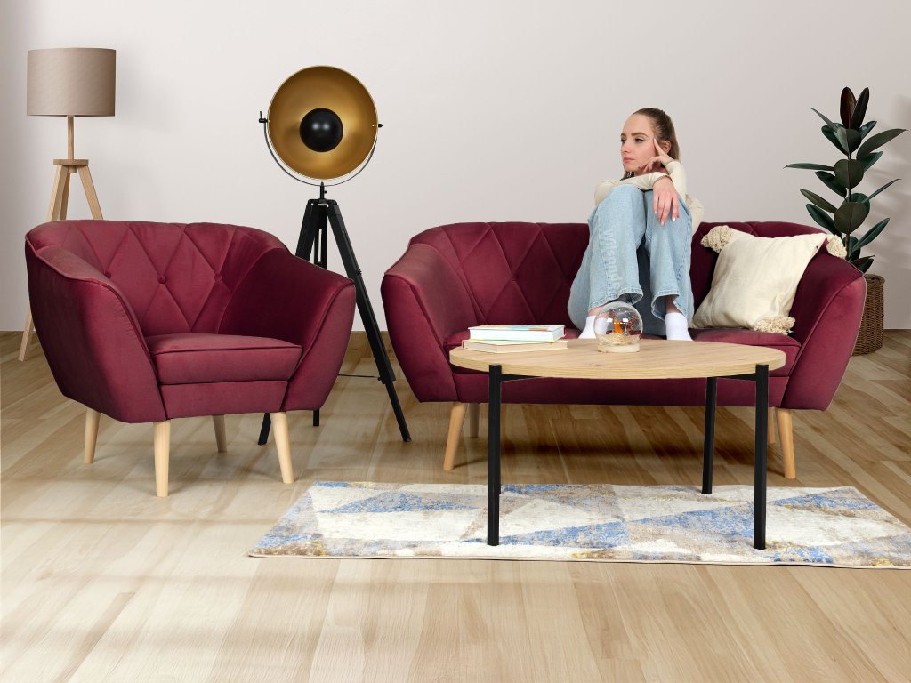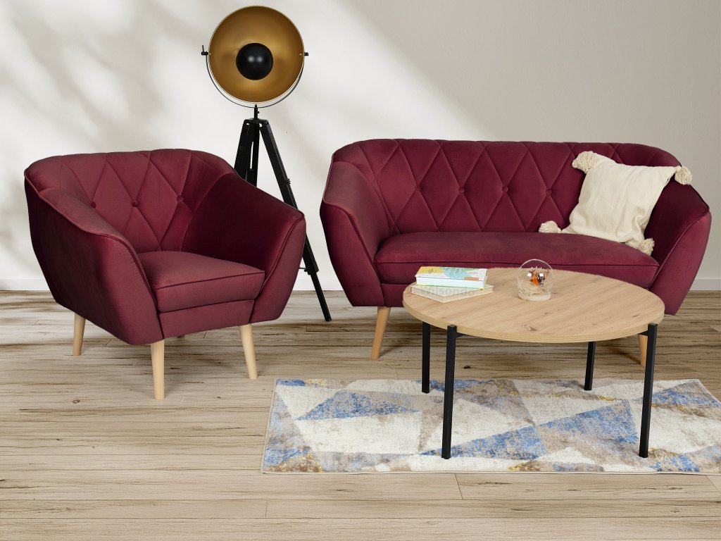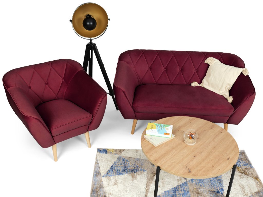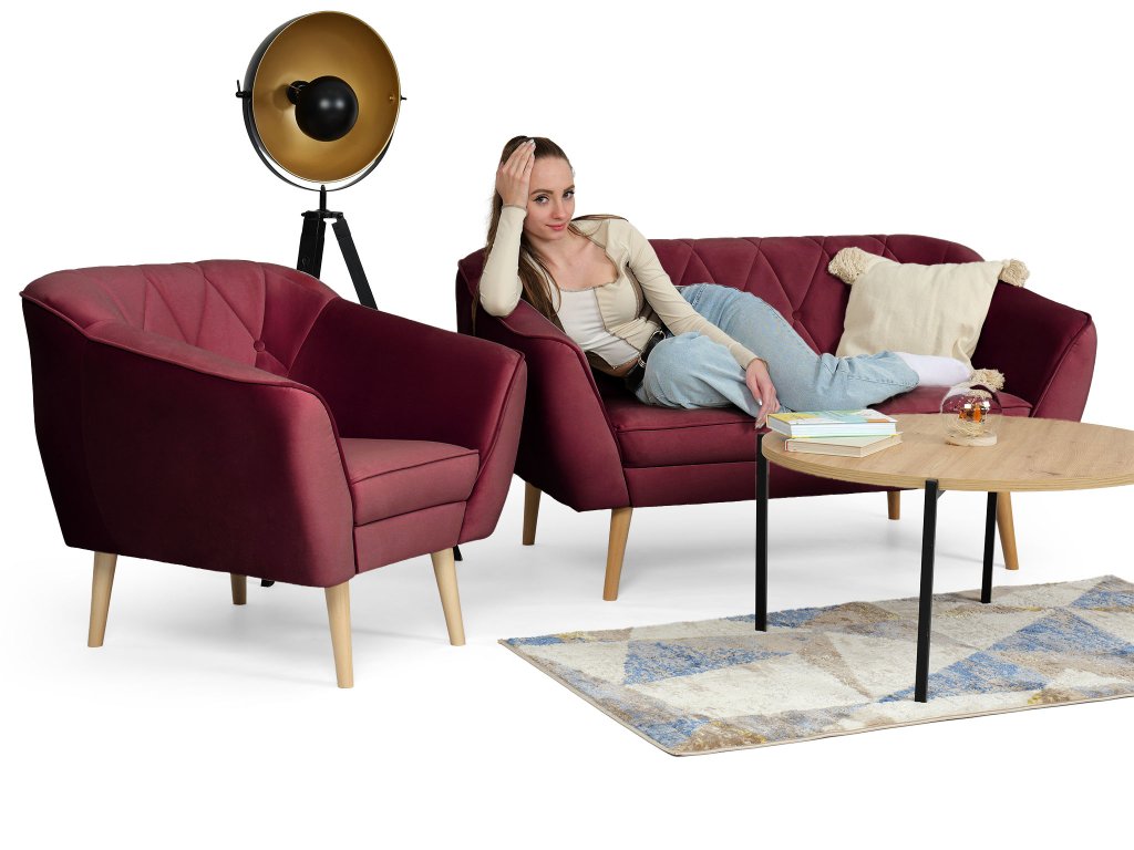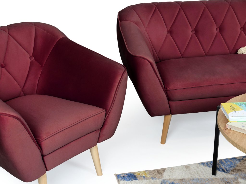 A bordó színe eleganciát visz a szobába és otthonos légkört teremt. A teljes garnitúra natúr színű stabil tömör fa lábakon áll, amelyek kiemelik a skandináv designt, és biztosítják a bútor strapabírását és stabilitását.