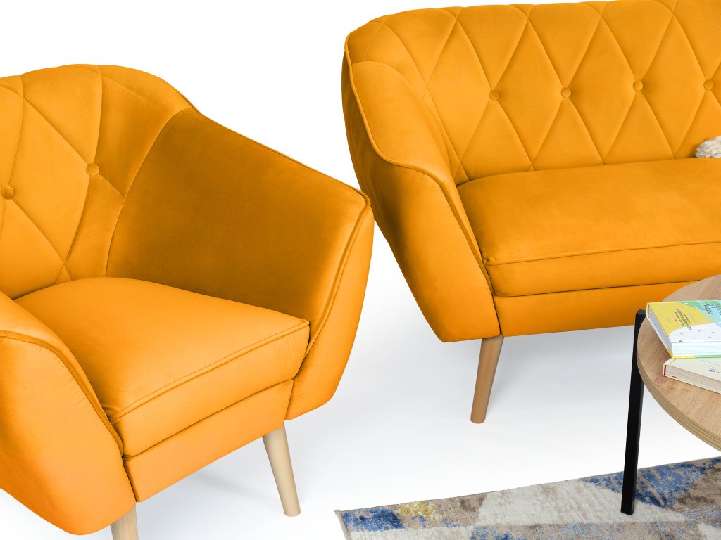 A narancssárga szín játékosságot visz a szobába, meleg árnyalata pedig otthonos légkört teremt. A teljes garnitúra natúr színű stabil tömör fa lábakon áll, amelyek kiemelik a skandináv designt, és biztosítják a bútor strapabírását és stabilitását.
