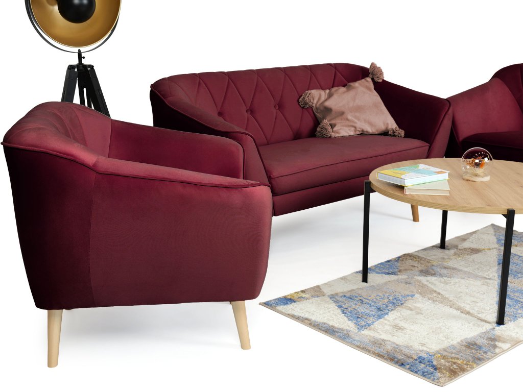 Ez a gyönyörű bordó színű ülőgarnitúra szett egyetlen otthonban sem marad figyelmen kívül. A Deana ülőgarnitúra szett 3+2+1 kombinációban kapható és tartalmaz egy fotelt, egy kétszemélyes és egy háromszemélyes kanapét. Mindkét kanapét és a fotelt is úgy tervezték, hogy ne csak a külalakjuk legyen nem mindennapi, de különleges kényelmet is garantáljanak. Minden darab küllemét csinosítja a háttámla elegáns steppelése, mely T25 habbal van kitöltve. Az ülőrészt T30 hab alkotja, amely biztosítja a problémamentes, hosszú és főleg kényelmes használatát. A profilozott háttámlák és kartámlák tökéletes ergonómiai kényelmet biztosítanak. Ezzel a két kanapéval és a fotellel egy gyönyörű, modern, skandináv stílusú otthont varázsolhat majának. A szett tökéletes választás lehet a nappaliba, de akár szépségszalonokba, éttermekbe, kávézókba is megfelelő. A kanapék és a fotel is natúr színű tömör fa lábakon állnak.