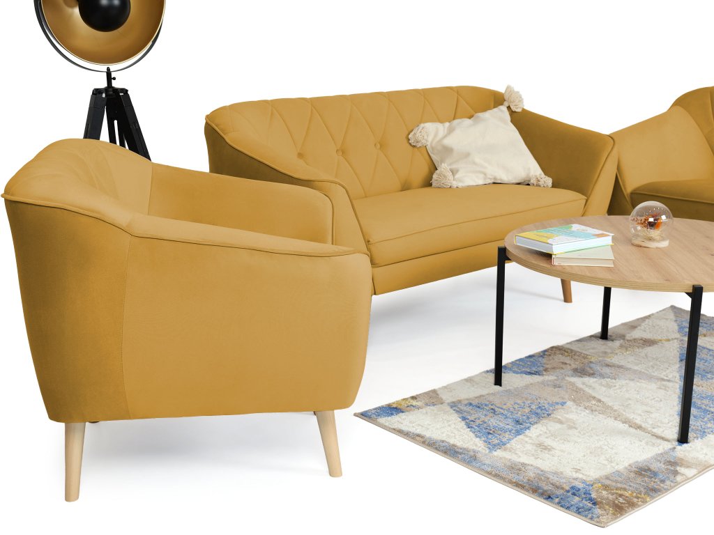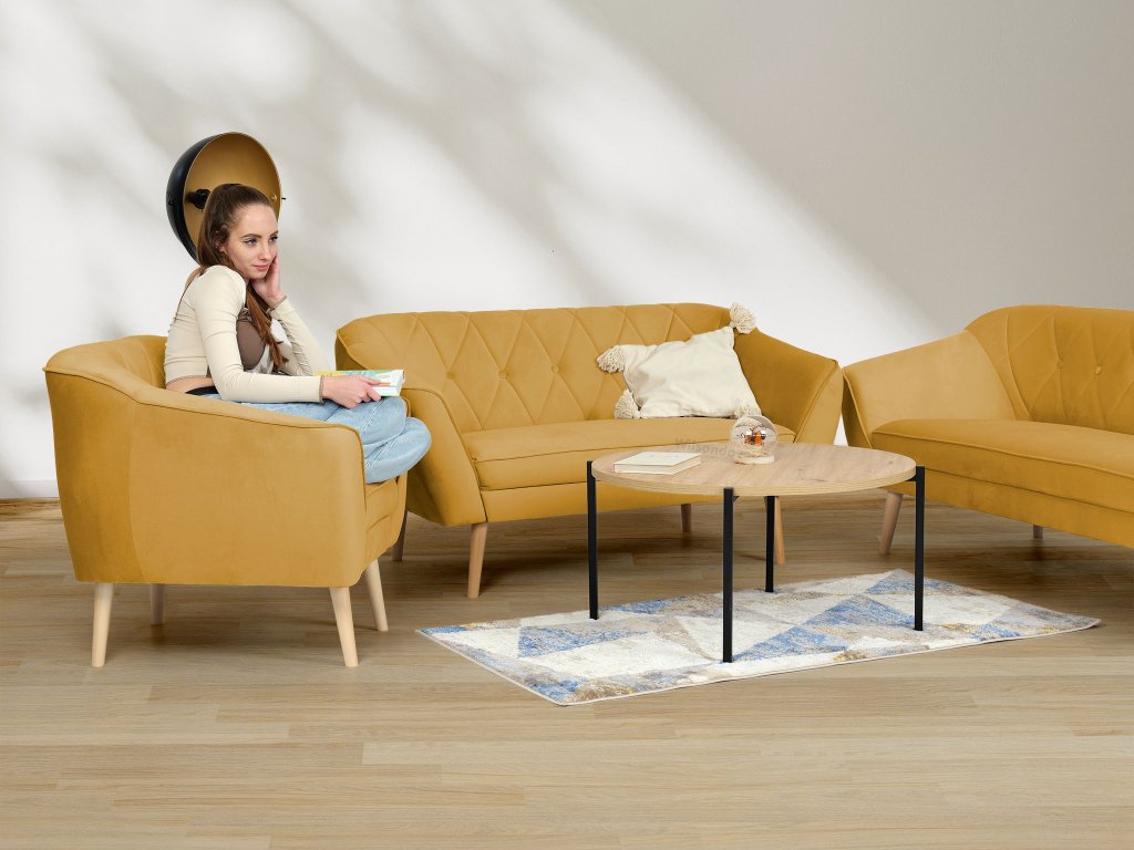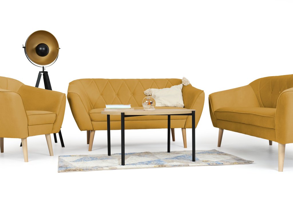 A ragyogóan gyönyörű mustársága Deana ülőgarnitúra szett 3+2+1 kombinációban kapható és tartalmaz egy fotelt, egy kétszemélyes és egy háromszemélyes kanapét is. Mindkét kanapét és a fotelt is úgy tervezték, hogy ne csak a külalakjuk legyen nem mindennapi, de különleges kényelmet is garantáljanak. Minden darab küllemét csinosítja a háttámla elegáns steppelése, mely T25 habbal van kitöltve. Az ülőrészt T30 hab alkotja, amely biztosítja a problémamentes, hosszú és főleg kényelmes használatát. A profilozott háttámlák és kartámlák tökéletes ergonómiai kényelmet biztosítanak. Ezzel a két kanapéval és a fotellel egy gyönyörű, modern, skandináv stílusú otthont varázsolhat majának. A szett tökéletes választás lehet a nappaliba, de akár szépségszalonokba, éttermekbe, kávézókba is megfelelő. A kanapék és a fotel is natúr színű tömör fa lábakon állnak.