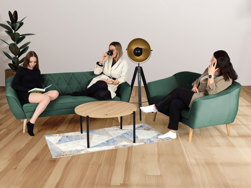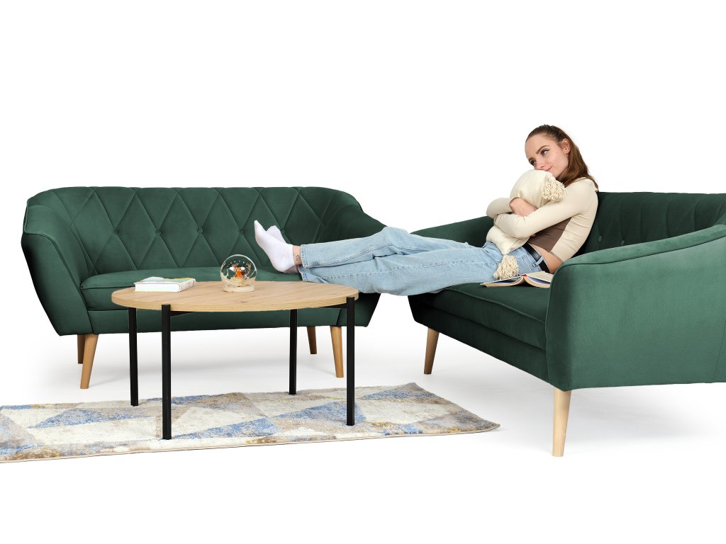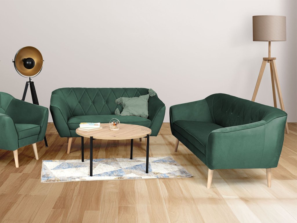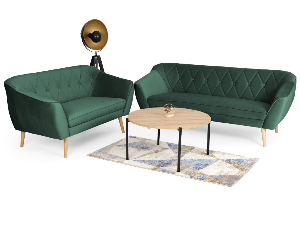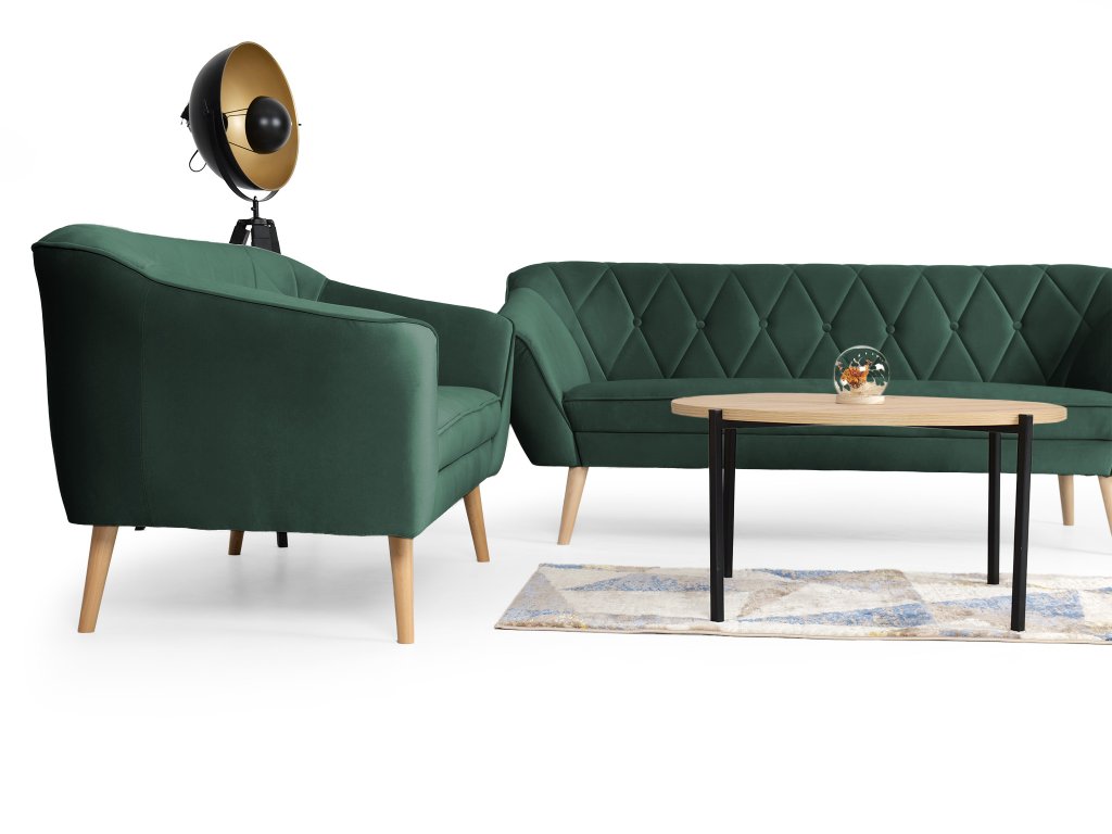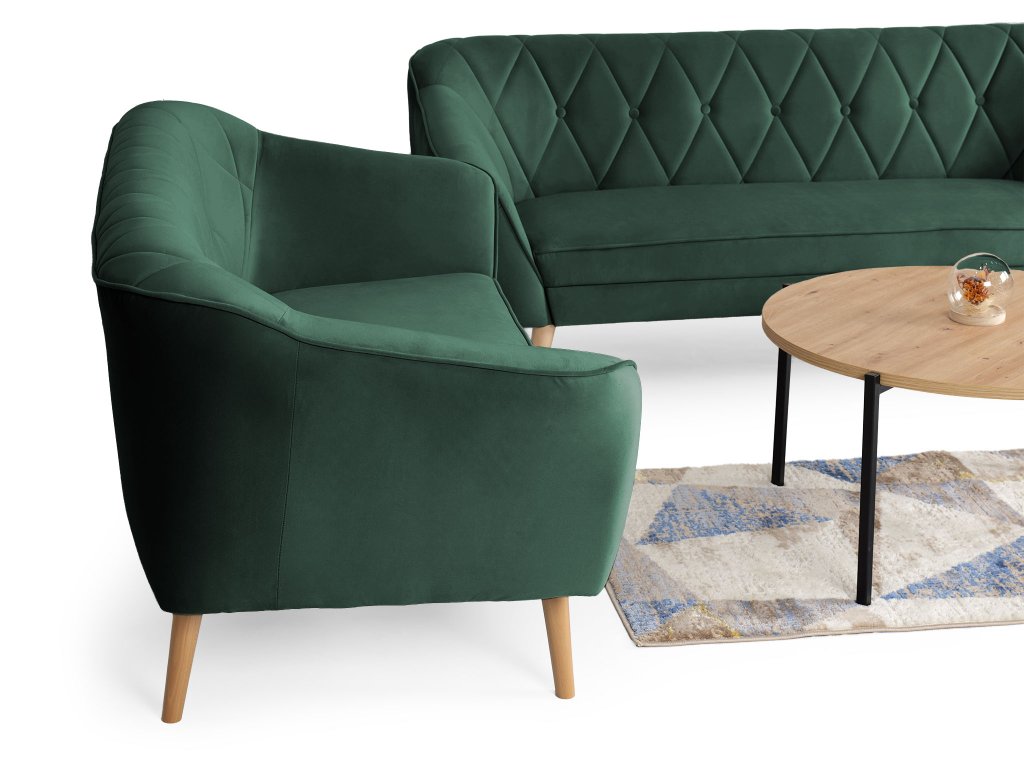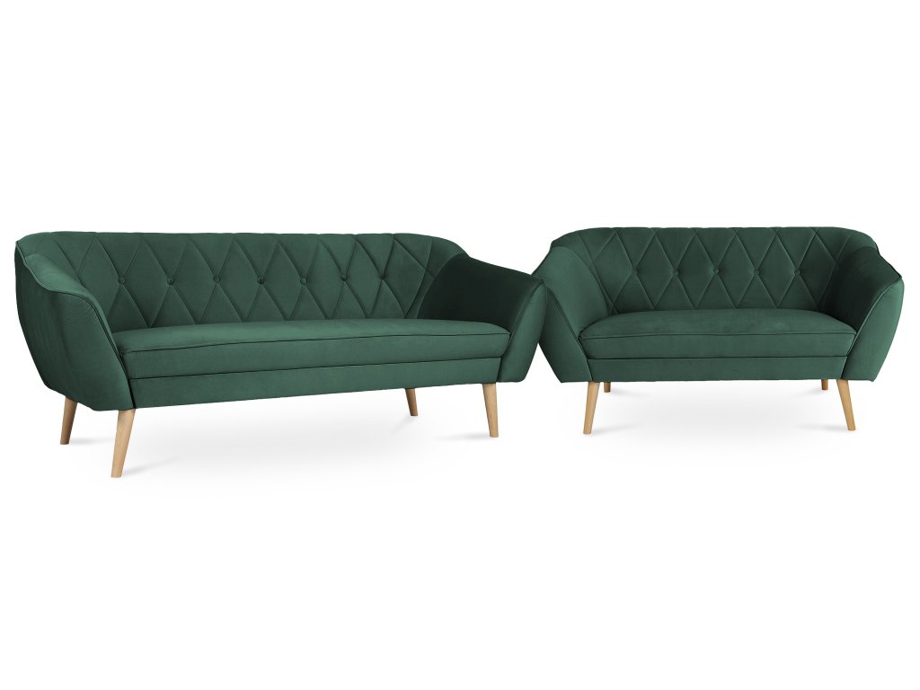 Rendezze be nappaliját stílusosan a zöld színű DEANA 3+2 kanapé szett segítségével. Ez a garnitúra egy kétszemélyes és egy háromszemélyes kanapéból áll. Ezzel a két kanapéval egy gyönyörű, modern, skandináv stílusú otthont varázsolhat majának. Mindkét kanapét úgy tervezték, hogy ne csak a külalakjuk legyen nem mindennapi, de különleges kényelmet is garantáljanak. A kanapék küllemét csinosítja a háttámla elegáns steppelése, mely T25 habbal van kitöltve. Az ülőrészt T30 hab alkotja, amely biztosítja a problémamentes, hosszú és főleg kényelmes használatát. A profilozott háttámlák és kartámlák tökéletes ergonómiai kényelmet biztosítanak. Ez a szett tökéletes választás lehet a nappaliba, de akár szépségszalonokba, éttermekbe, kávézókba is megfelelő lehet. A kanapék natúr színű tömör fa lábakon állnak.