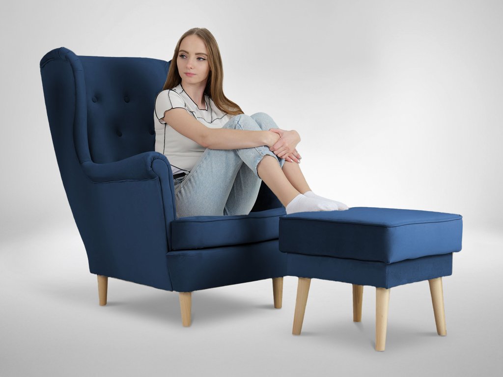 Gyönyörű kék szövettel kárpitozott DEANA bútor szett, amely nem csak Önt, de vendégeit is lenyűgözi majd. Az összeállítás egy DEANA füles fotelt és egy DEANA lábtartót tartalmaz, amelyek együtt biztosítják majd a kényelmes pihenését. A fotel Velúr Royal szövettel kárpitozott, amely nagyon kellemes tapintású és ellenálló a bolyhozódással szemben is. A fotel ráadásul gyönyörű gombokkal is díszített, amely még inkább növeli az eleganciáját. A füles fotel minőségi anyagokból készül, a lakás vagy a ház szinte bármely helyiségében elhelyezhető. A profilozott háttámlára és karfára T25, az ülésre T30 keménységű habot használtak fel. A fotel tömör fából készült lábakon áll natúr színben. A fotel tisztítását nagyban segíti, hogy az ülőfelület kivehető.