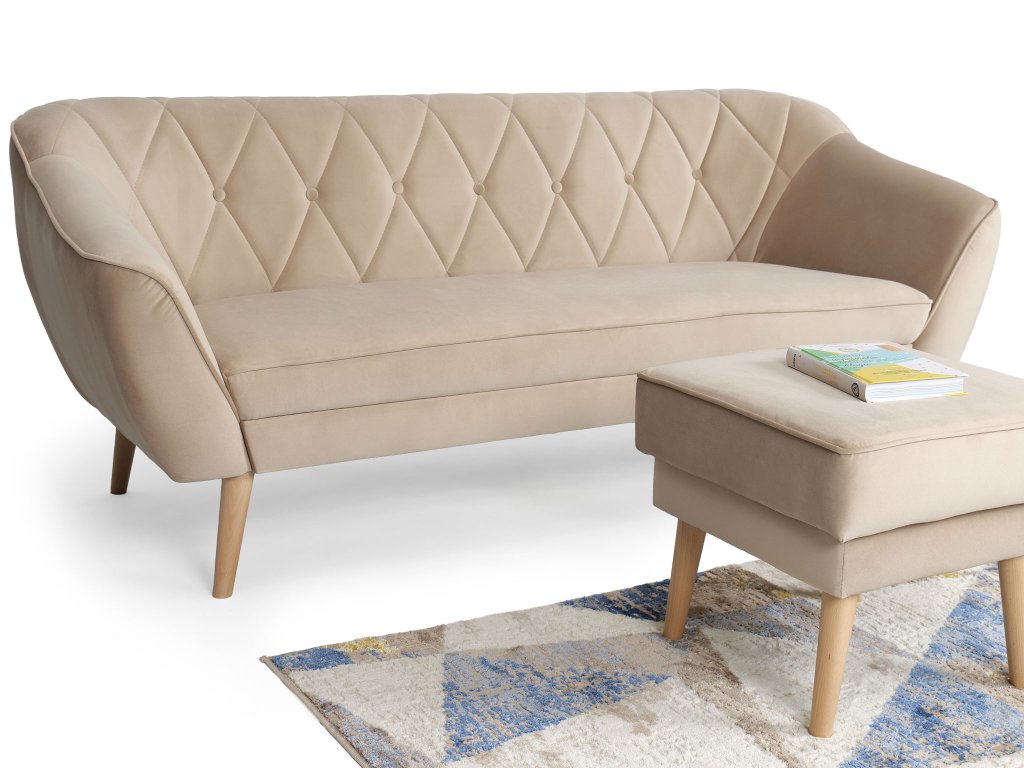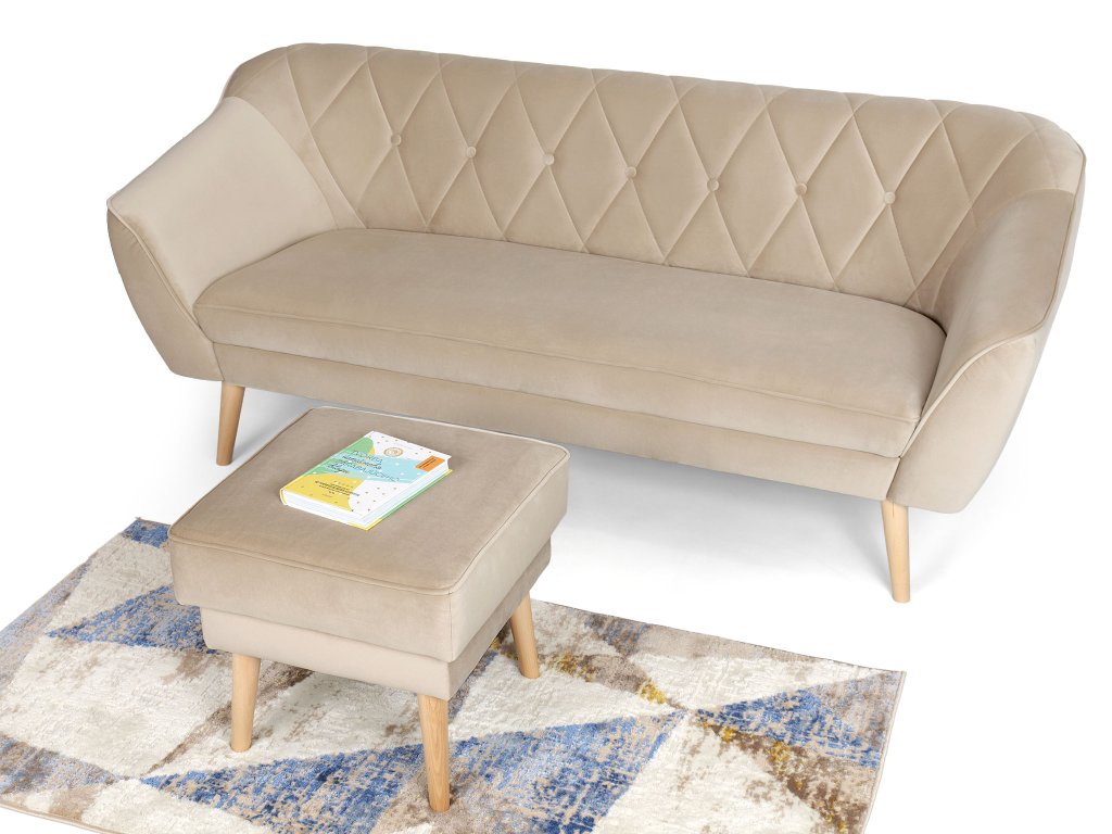 Amennyiben egy semleges bézs színű gyönyörű steppeléssel ellátott garnitúrát keres a Deana III háromszemélyes kanapé és lábtartó jó választást jelenthet. Karakteres és praktikus eleme lehet bármely nappalinak, dolgozószobának vagy akár a hálószobának is. Mindkét bútordarab Velúr Royal szövettel kárpitozott, egy igazán puha kárpitszövettel, amely nem bolyhozódik és bársonyos hatást kelt. Jól bírja a mindennapos használatot és idővel sem fakul ki. A bájos tömör fa lábak natúr színben egységes és harmonikus hatást garantálnak. A kanapé belsejét kétféle hab kombinációja alkotja: a puhább T25-ös hab a háttámlában kényelmes támaszt biztosít, míg a sűrűbb T30-as hab az ülőfelületekben pedig gondoskodik a puha, ugyanakkor stabil üléspozícióról. A Deana garnitúra ideális választás mindazok számára, akik az esztétika, a funkcionalitás és a kényelem kombinációját keresik.