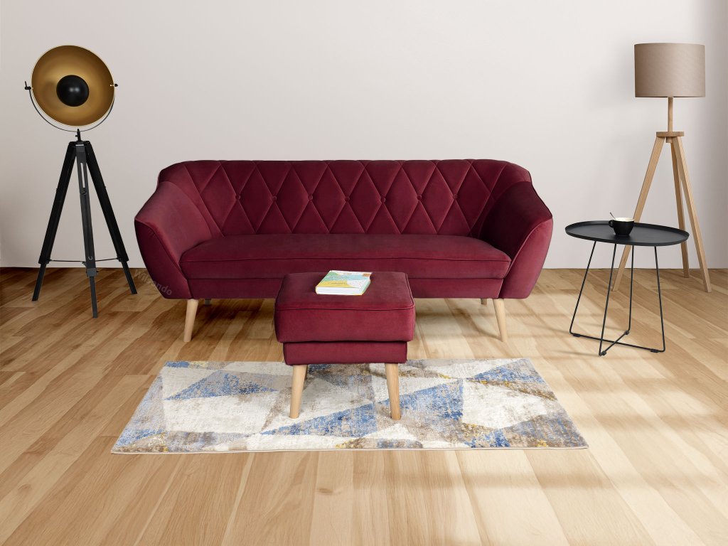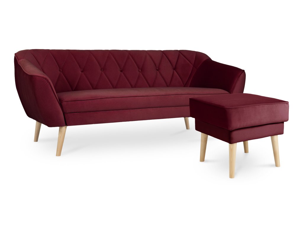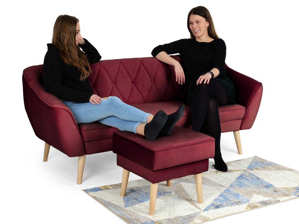 A Deana III háromszemélyes bordó kanapé puffal egyszerűen mindenhová tökéletes választást jelent. Dísze lesz a nappalinak, a dolgozószobának vagy akár a hálószobának is. Mindkét bútordarab Velúr Royal szövettel kárpitozott, egy igazán puha kárpitszövettel, amely nem bolyhozódik és bársonyos hatást kelt. Jól bírja a mindennapos használatot és idővel sem fakul ki. A bájos tömör fa lábak natúr színben egységes és harmonikus hatást garantálnak. A kanapé belsejét kétféle hab kombinációja alkotja: a puhább T25-ös hab a háttámlában kényelmes támaszt biztosít, míg a sűrűbb T30-as hab az ülőfelületekben pedig gondoskodik a puha, ugyanakkor stabil üléspozícióról. A Deana garnitúra ideális választás mindazok számára, akik az esztétika, a funkcionalitás és a kényelem kombinációját keresik.