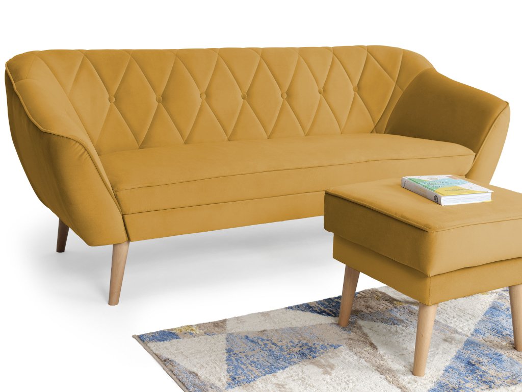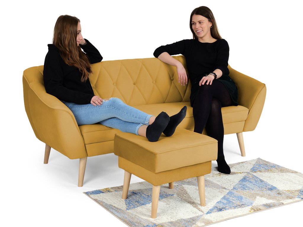 Ez a gyönyörű mustársárga garnitúra egyszerűen mindenkit levesz a lábáról. Választhatja az otthonába, de az irodában vagy a recepcióra is tökéletes. A Deana III kanapé puffal karakteres és praktikus eleme lehet bármely nappalinak, dolgozószobának vagy akár a hálószobának is. Mindkét bútordarab Velúr Royal szövettel kárpitozott, egy igazán puha kárpitszövettel, amely nem bolyhozódik és bársonyos hatást kelt. Jól bírja a mindennapos használatot és idővel sem fakul ki. A bájos tömör fa lábak natúr színben egységes és harmonikus hatást garantálnak. A kanapé belsejét kétféle hab kombinációja alkotja: a puhább T25-ös hab a háttámlában kényelmes támaszt biztosít, míg a sűrűbb T30-as hab az ülőfelületekben pedig gondoskodik a puha, ugyanakkor stabil üléspozícióról. A Deana garnitúra ideális választás mindazok számára, akik az esztétika, a funkcionalitás és a kényelem kombinációját keresik.