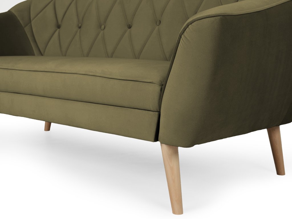 A DEANA olivazöld kanapé skandináv stílusban készül, minden szobába tökéletesen illik és minőségi alapanyagokból készül. A kanapé bársonyos Velúr Royal szövettel kárpitozott, amely kellemes és lágy tapintású, bolyhosodással szemben ellenálló. A kanapé küllemét csinosítja a háttámla steppelése, mely T25 habbal van kitöltve. Az egész kanapé natúr fából készült lábakon áll. Az ülést T30 hab alkotja, biztosítja a problémamentes, hosszú és főleg kényelmes használatát.