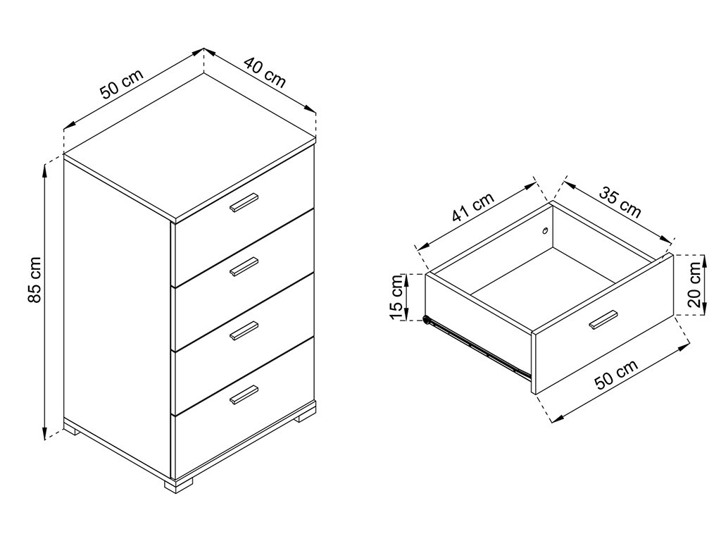 A lágy fehér színben kapható komód rengeteg tároló helyet kínál a különböző tárgyak, ruhák vagy dokumentumok elhelyezésére. A tetejére növényeket vagy dekorációs tárgyakat helyezhet el. Használható a gyermekszobában, a nappaliban vagy a hálószobában. 16 mm-es laminált deszkából készül. A széleket ABS élekkel zárták le. A bútor 4 tágas fiókkal rendelkezik.