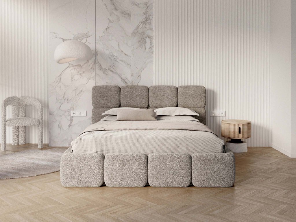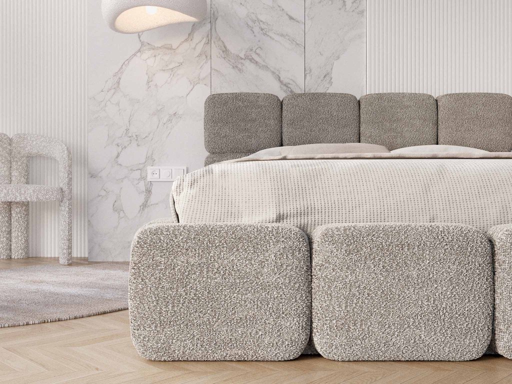 Buklé szövettel kárpitozott DELICATO franciaágy 160x200 cm nagy és masszív háttámlával. A precízen kárpitozott szürke ágy kárpitozásához exkluzív BOUCLE szövetet használtak fel, amely melegséget és kifinomultságot kölcsönöz az ágynak. Garantáljuk, hogy ebbe az ágyba az első látásra és érintésre beleszeret majd az ember. A domináns háttámla nemcsak esztétikai szerepet tölt be, de kényelmes támaszt is biztosít az esti könyvolvasáshoz vagy tévénézéshez. A Delicato nem csupán egy ágy, hanem egy nyugalmas menedék, amely a hálószobát a kikapcsolódás, a pihenés és a kényelem oázisává varázsolja. Tökéletes választás mindazoknak, akik a funkcionalitást és a designos megjelenést egyaránt értékelik.