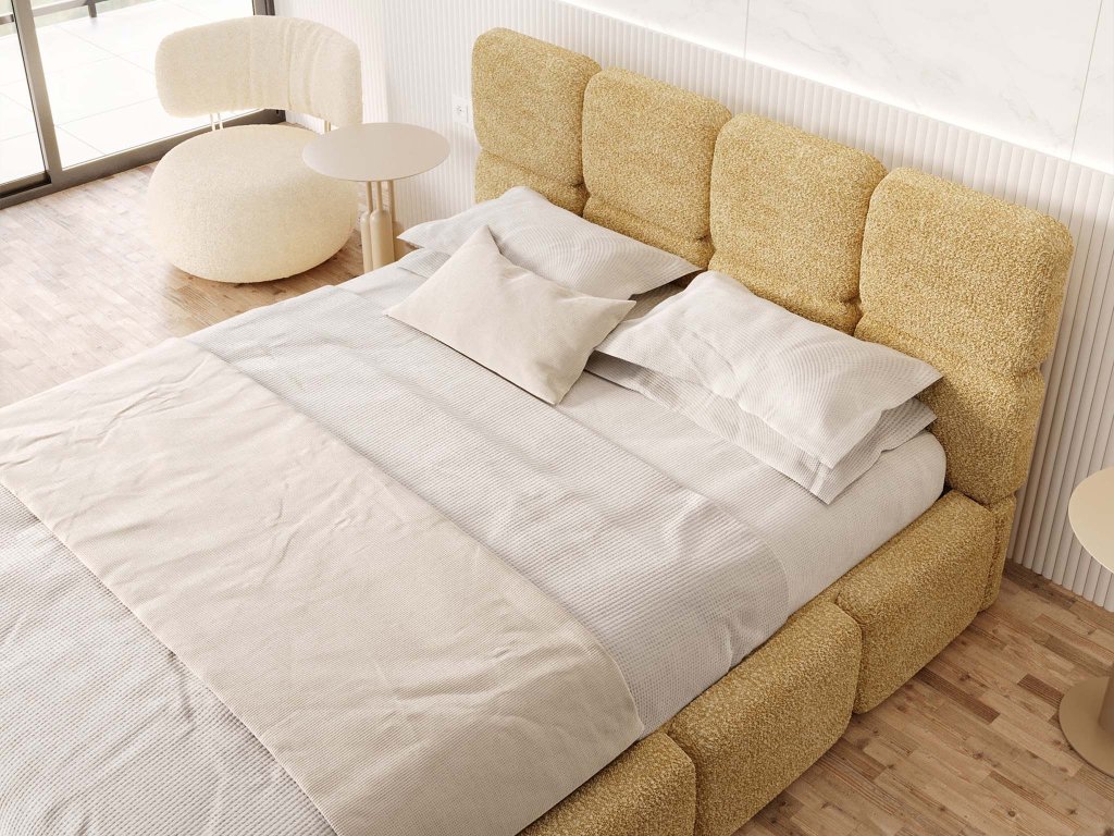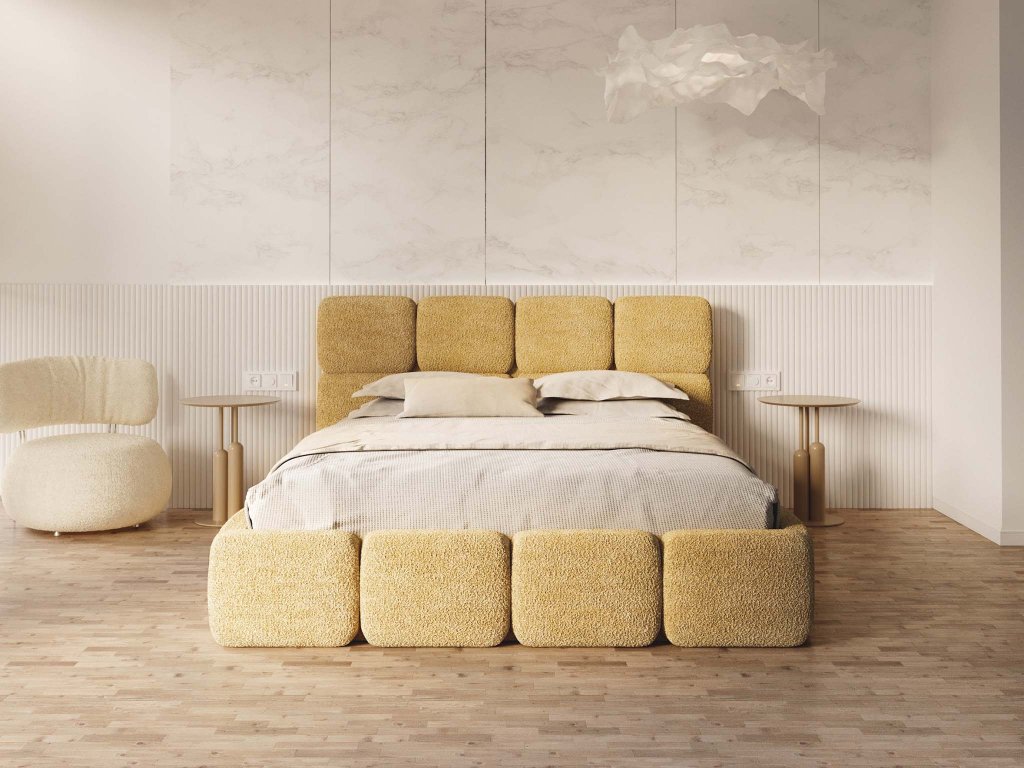 Nem mindennapi színben készült sárga buklé szövettel kárpitozott DELICATO franciaágy 180x200 cm. Már a neve is mindent elárul – a Delicato finomságot, luxust és időtálló stílust visz a hálószobába. A precízen kárpitozott ágy kárpitozásához exkluzív BOUCLE szövetet használtak fel, amely melegséget és kifinomultságot kölcsönöz az ágynak. Garantáljuk, hogy ebbe az ágyba az első látásra és érintésre beleszeret majd az ember. A domináns, függőleges steppeléssel díszített háttámla nemcsak esztétikai szerepet tölt be, de kényelmes támaszt is biztosít az esti könyvolvasáshoz vagy tévénézéshez. A Delicato nem csupán egy ágy, hanem egy nyugalmas menedék, amely a hálószobát a kikapcsolódás, a pihenés és a kényelem oázisává varázsolja. Tökéletes választás mindazoknak, akik a funkcionalitást és a designos megjelenést egyaránt értékelik.