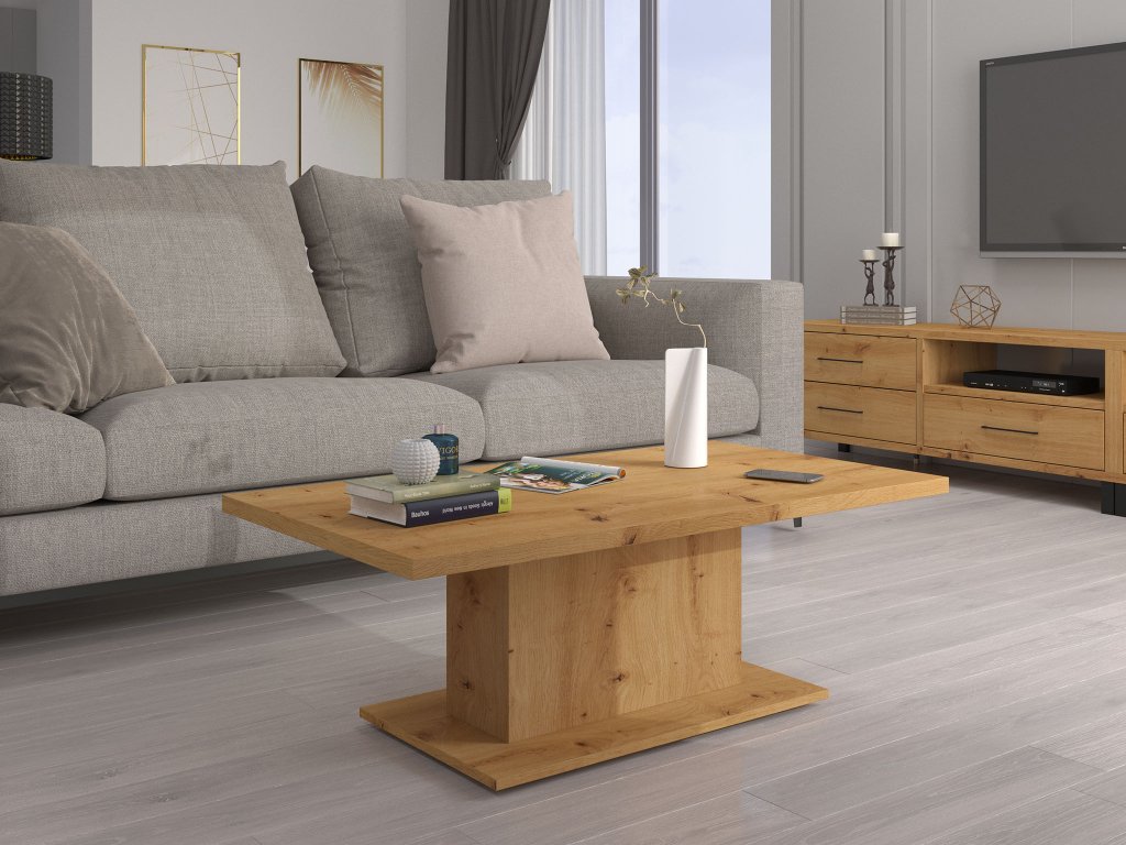 DENVIN dohányzóasztal gyönyörű artisan tölgy színváltozatban, amely igazán univerzális kinézettel rendelkezik. Az asztal megfelelő lehet bárhová – a modern minimalizmustól a skandináv elegancián át egészen a klasszikus stílusban berendezett otthonokig. Tökéletes választás a nappaliba, a dolgozószobába vagy az irodába is. Kiváló minőségű és tartós anyagokból készült, így hosszú élettartamot és könnyű karbantartást biztosít. A laminált bútorlap ABS élzárással van biztosítva, amely megóvja az asztalt a karcolásoktól és a sérülésektől. Felülete egyszerűen tisztán tartható, ellenáll a mindennapos szennyeződéseknek. Az asztal meghatározó eleme a középen elhelyezett stabil lába, amely erős alátámasztást biztosít, emellett érdekes dizájnelemként is szolgál. A Denvin dohányzóasztal ideális megoldás, ha olyan funkcionális, de egyben stílusos kiegészítőt keres, amely jól illik a kanapéhoz és a fotelhez.