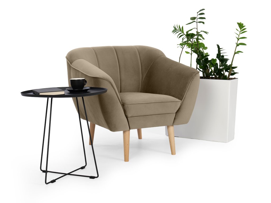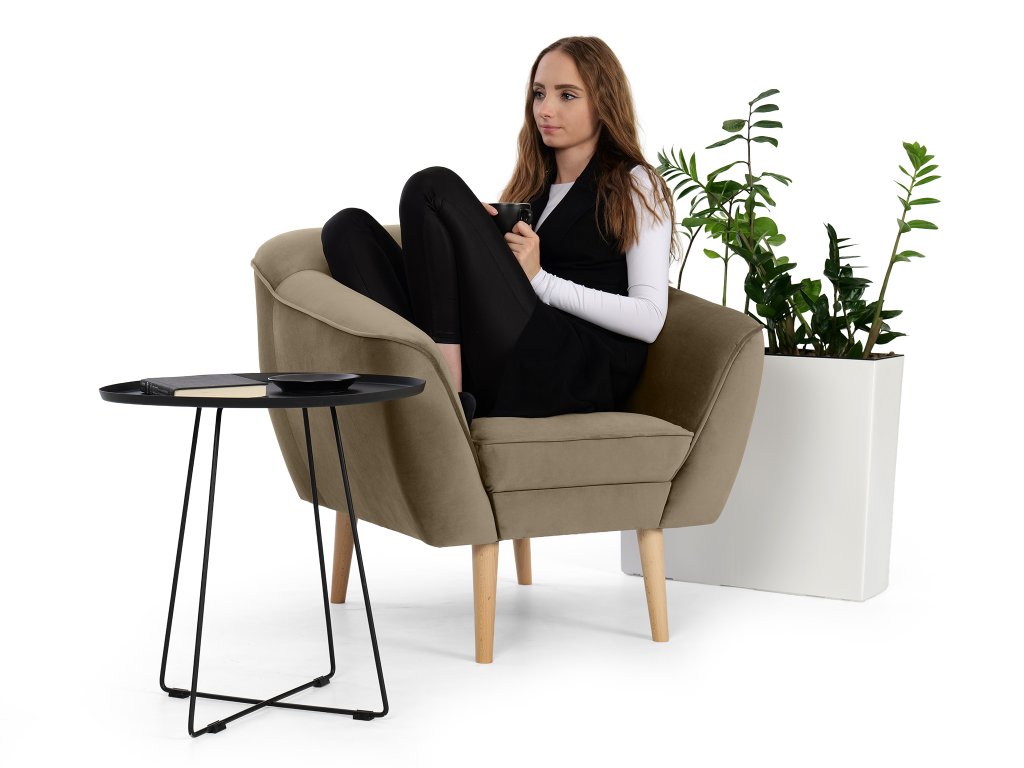 A Díva a modern stílust és a praktikus kényelmet ötvözi. Ez a skandináv stílusú fotel gondosan kidolgozott, elegánsan steppelt háttámlával rendelkezik, míg a minőségi közepes keménységű habbal töltött ülőfelület kivételes kényelmet nyújt az olvasáshoz vagy a pihenéshez. Masszív szerkezete stabilitást és hosszú élettartamot garantál. Világosbarna színe időtálló és elegáns megjelenést kölcsönöz neki, és könnyen kombinálható különböző lakberendezési stílusokkal. A modern Diva fotel tökéletesen illik a nappaliba, a dolgozószobába, de akár a hálószobába is vagy egy hangulatos olvasósarokba..