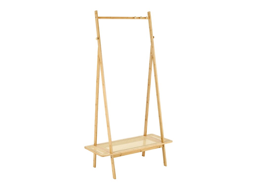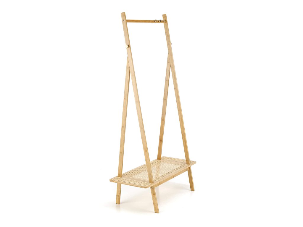 Gyönyörű boho stílusú DLOSIA WU33 ruhaállvány, amely bambuszból készült. Ez a ruhatartó állvány nem csak egy praktikus helyet biztosít a ruháinak, de stílusos kiegészítő is minden otthonba. A ruhaállvány három gyönyörű arany színű akasztóval is el van látva, ahová felakaszthatja a kabátokat. Ezen kívül az aljában egy bécsi fonattal rendelkező praktikus rattan polc is helyet kapott. Az egész ruhatartó állvány a bambusz natúr színében készül, amely így igazán gyönyörű és természetes hatást kelt. Ez az akasztó nem csak egy designos bútordarab, de bájt és eleganciát is kölcsönöz majd a szobának, ahová elhelyezi.