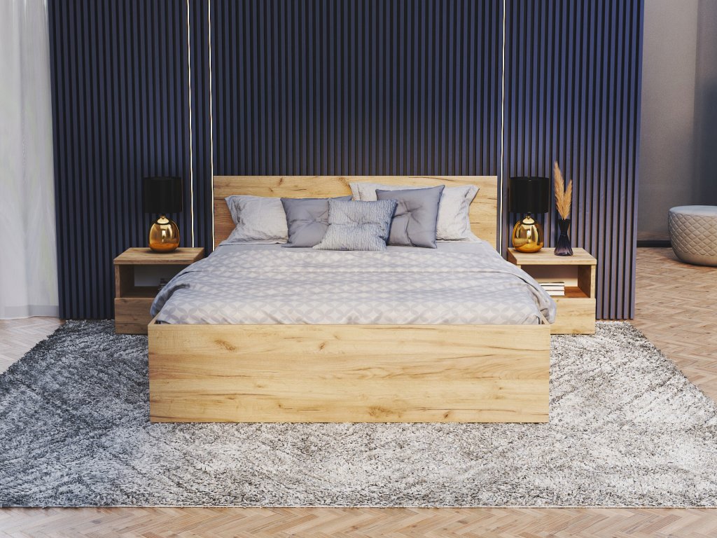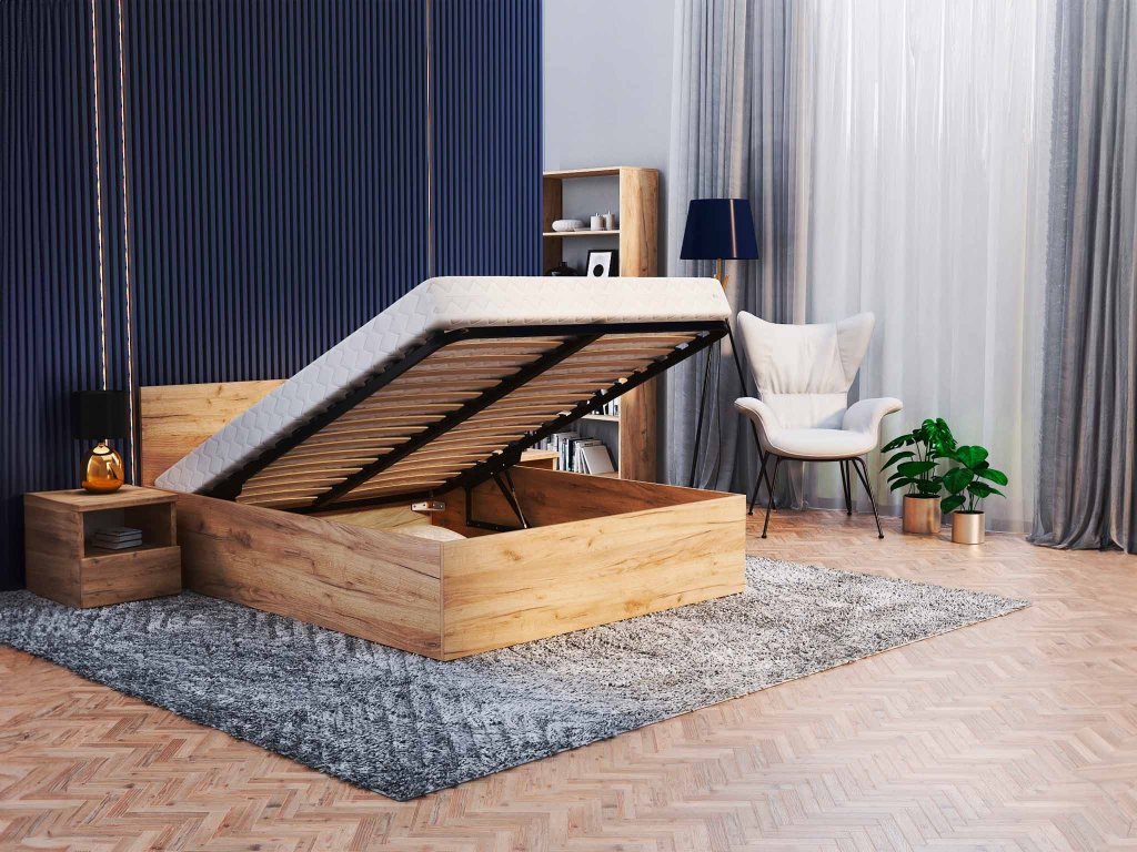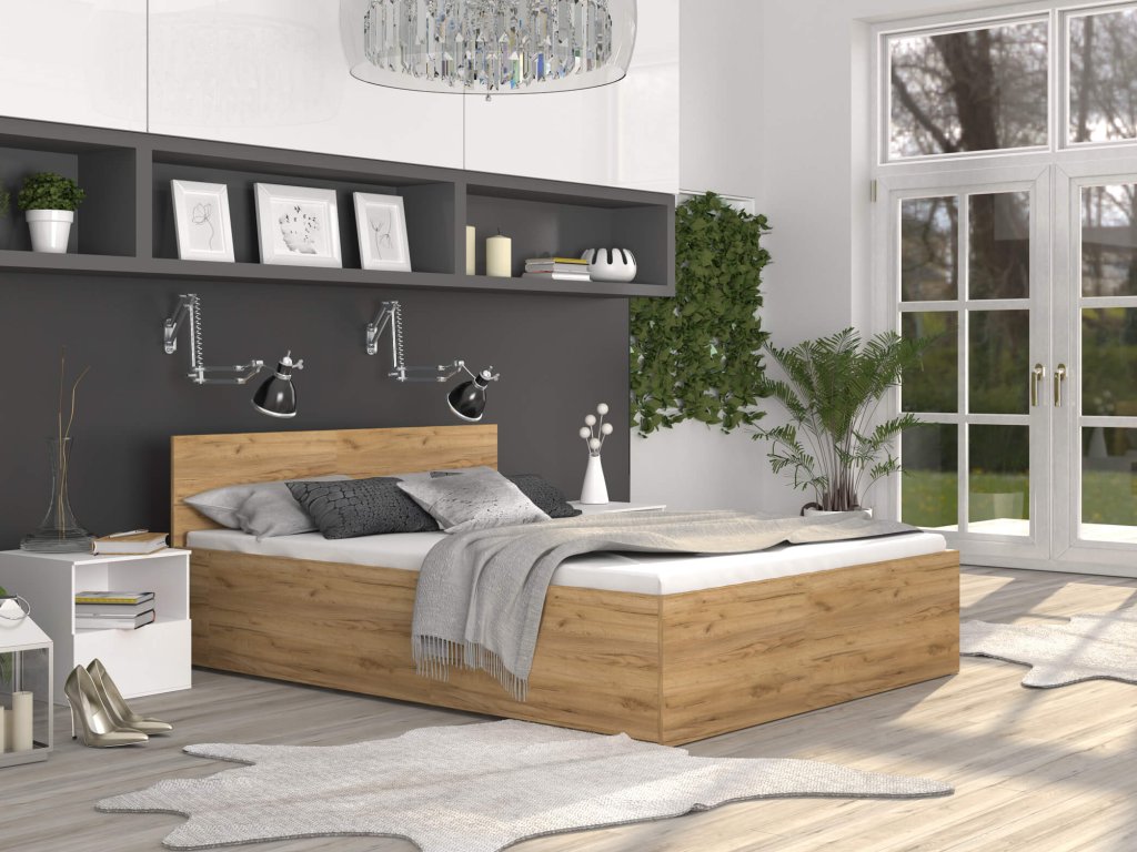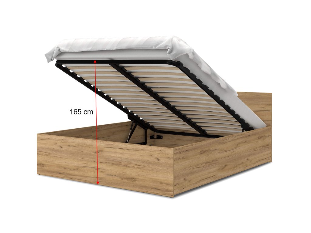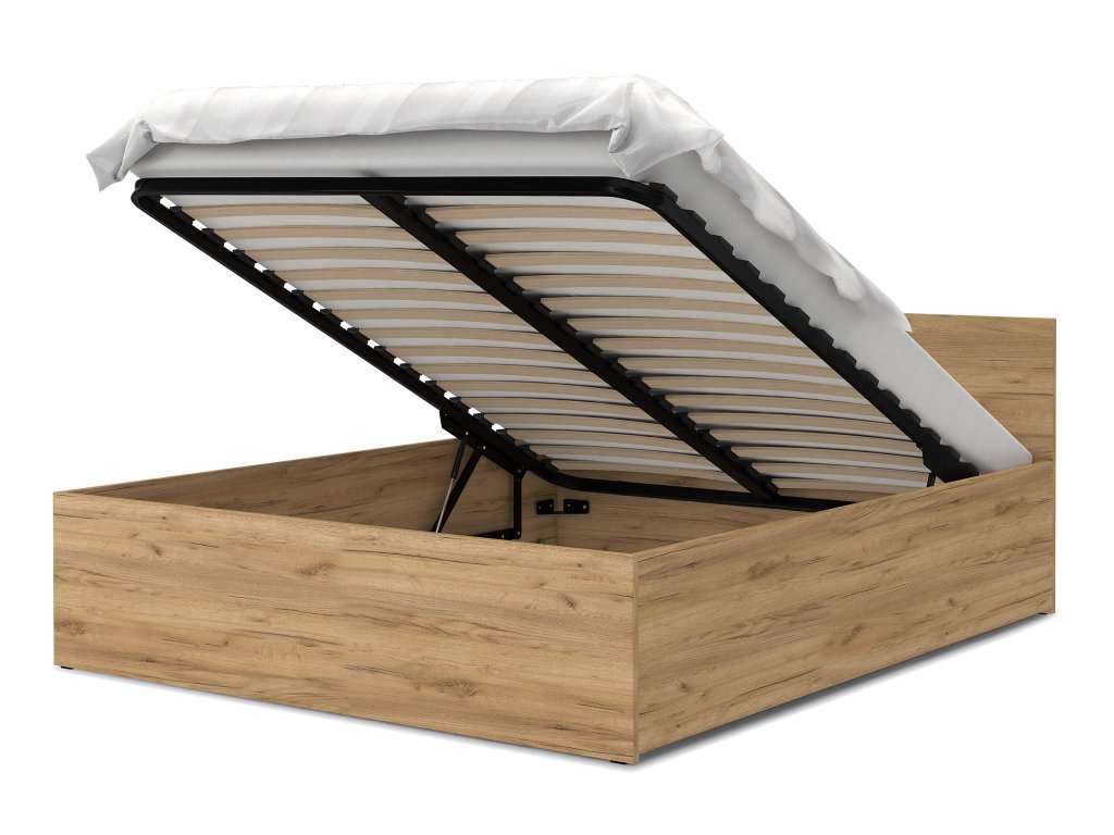 DOLLY franciaágy ágyneműtartóval klasszikus stílusban gyönyörű craft tölgy színben. Az ágy tágas tárolóval rendelkezik, amely így elegendő helyet biztosít az ágynemű és egyéb dolgok tárolására. Az ágy szerkezete minőségi 16-18 mm vastag DTD bútorlapból készül, ellenálló és könnyen tisztítható. Az ágy része a minőségi fém ágyrács fa lamellákkal. Az ágyrács felemelését 2 darab gázrugó végzi, amelyek egyenként 400N - 1000N kitolóerejűek lehetnek, az ágy méretétől függően.