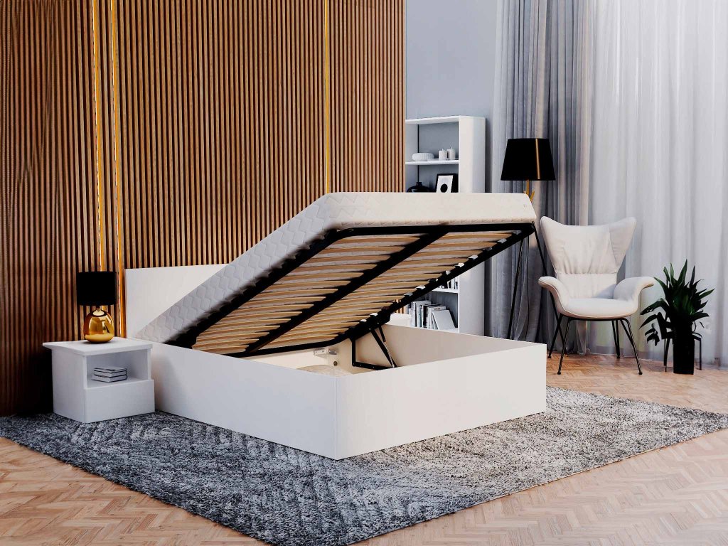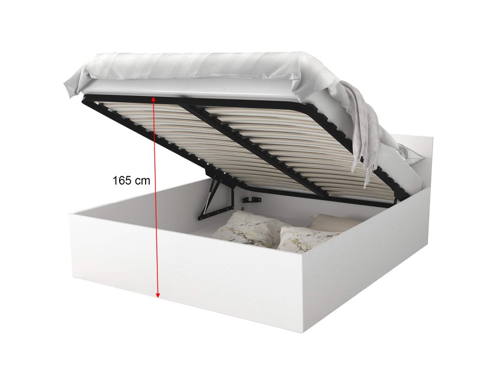 Modern DOLLY franciaágy ágyneműtartóval klasszikus stílusban. Az ágy tágas tárolóval rendelkezik, amely így elegendő helyet biztosít az ágynemű és egyéb dolgok tárolására. Az ágy szerkezete minőségi 16-18 mm vastag DTD bútorlapból készül, ellenálló és könnyen tisztítható. Az ágy része a minőségi fém ágyrács fa lamellákkal. Az ágyrács felemelését 2 darab gázrugó végzi, amelyek egyenként 400N - 1000N kitolóerejűek lehetnek, az ágy méretétől függően.