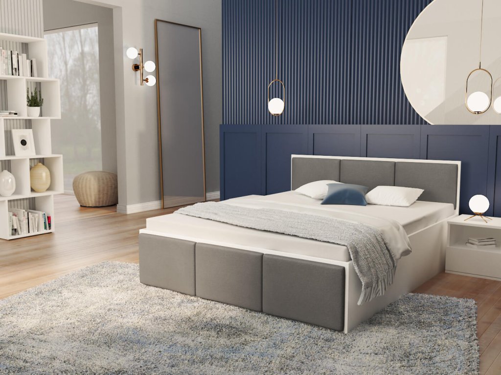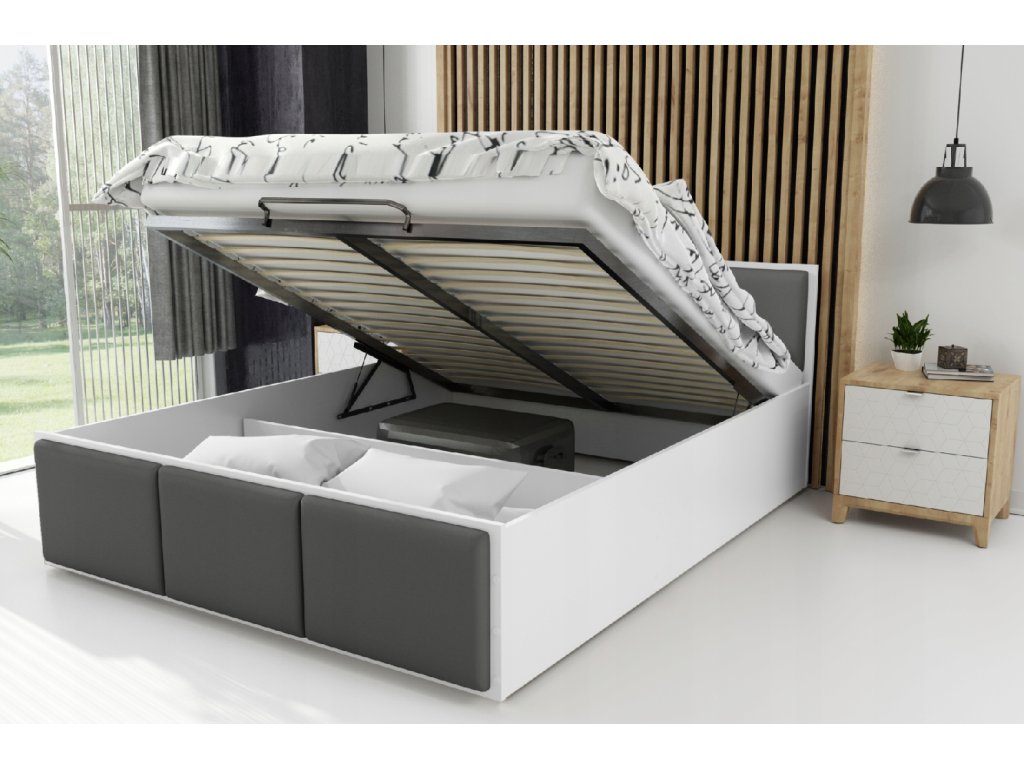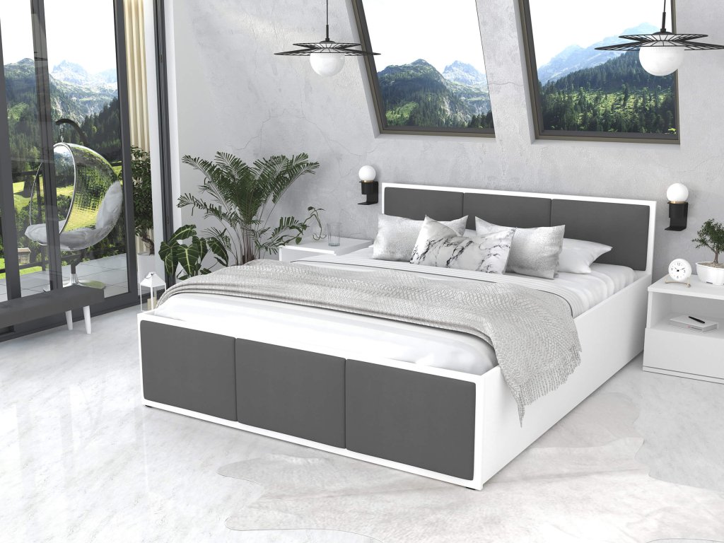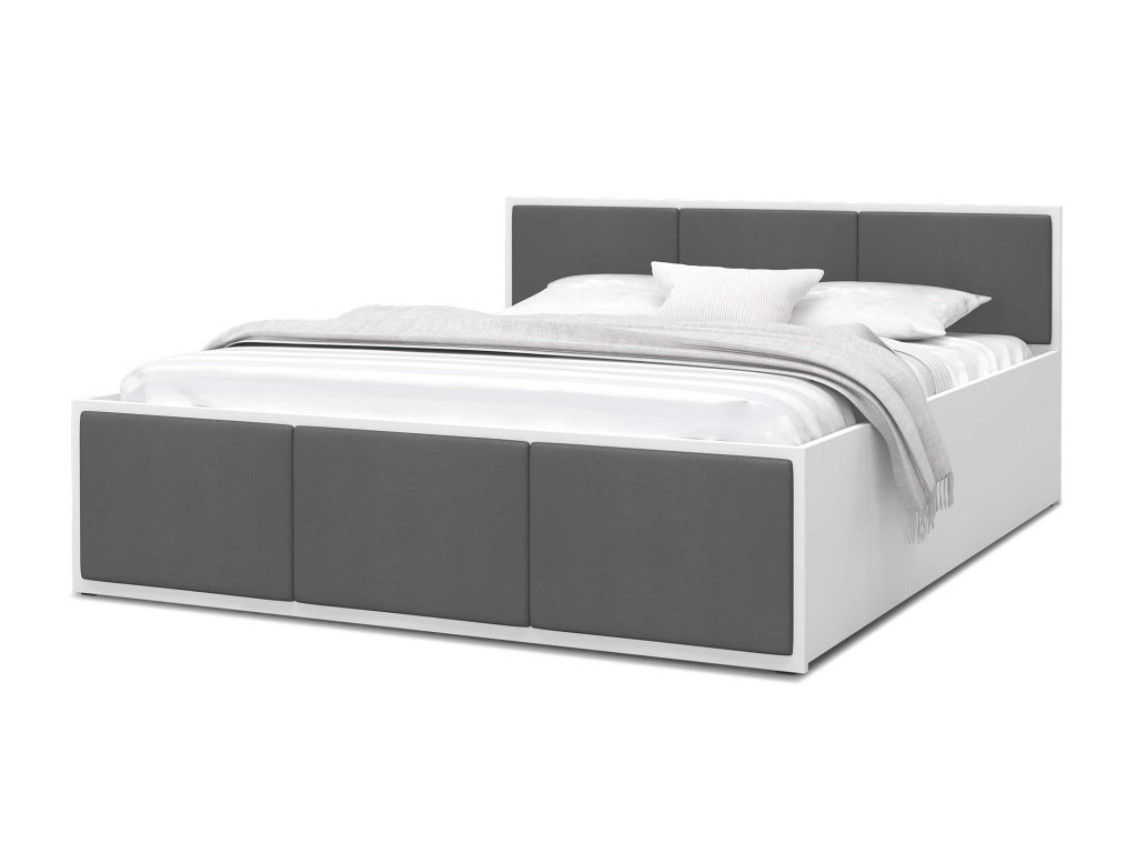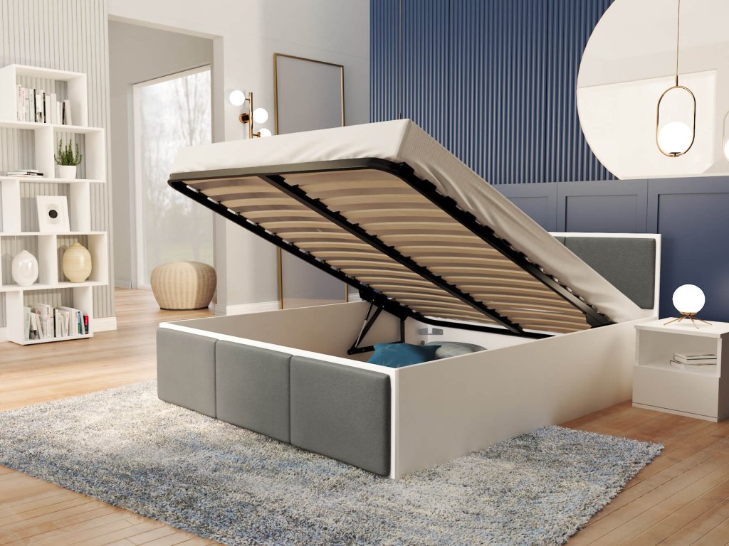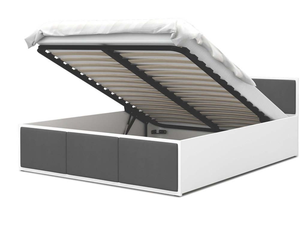 DOLLY fehér - grafit kárpitozott egyszemélyes ágy 120 x 200 cm ágyneműtartóval, amely egyszerű dizájnnal rendelkezik, amelyet gyönyörű kárpitozással egészítették ki. Az ágy tágas felnyitható ágyneműtartóval is rendelkezik, ahová elteheti az ágyneműt, plédeket, takarókat és egyéb apróságokat. Az ágy szerkezete minőségi DTD bútorlapból készült 16-18 mm vastagsággal, amely nagyon ellenálló és könnyen tisztítható. Az ágy végei kárpitozott panelekkel vannak díszítve, amelyek színt visznek a hálószobába. A kárpitozó anyag nagyon ellenálló a bolyhozódással szemben és kellemes tapintású. Az ágy részét képezi a minőségi fém ágyrács fa lamellákkal.