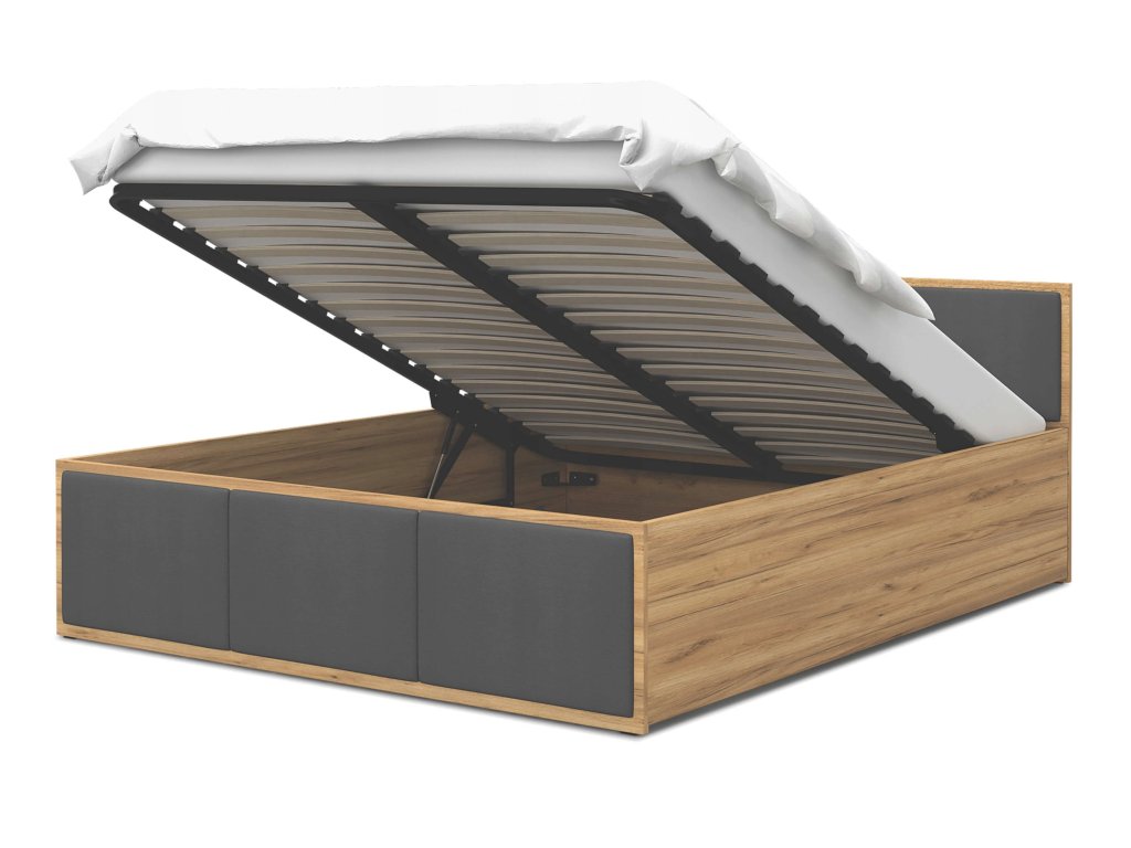DOLLY kárpitozott franciaágy ágyneműtartóval craft tölgy és grafit szín kombinációjában, amely egyszerű dizájnnal rendelkezik, de gyönyörű kárpitozással egészítették ki. Az ágy tágas felnyitható ágyneműtartóval is rendelkezik, ahová elteheti az ágyneműt, plédeket, takarókat és egyéb apróságokat. Az ágy szerkezete minőségi DTD bútorlapból készült 16-18 mm vastagsággal, amely nagyon ellenálló és könnyen tisztítható. Az ágy végei kárpitozott panelekkel vannak díszítve, amelyek színt visznek a hálószobába. A kárpitozó anyag nagyon ellenálló a bolyhozódással szemben és kellemes tapintású. Az ágy részét képezi a minőségi fém ágyrács fa lamellákkal. Az ágyrács felemelését 2 darab gázrugó végzi, amelyek egyenként 400N - 1000N kitolóerejűek lehetnek, az ágy méretétől függően.