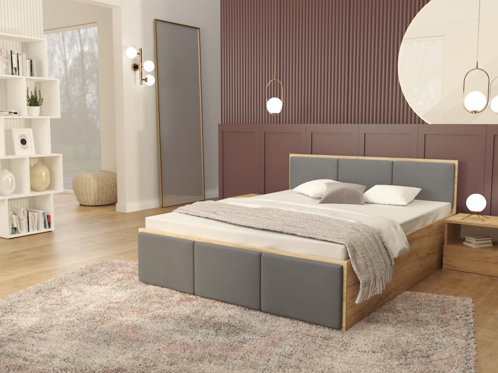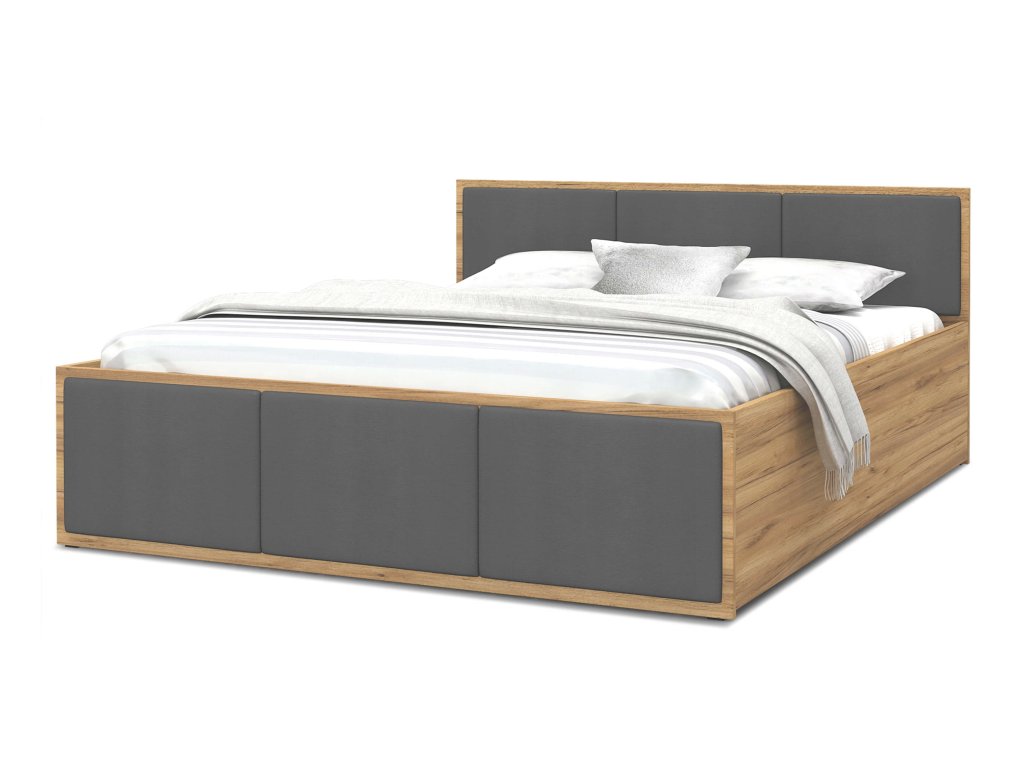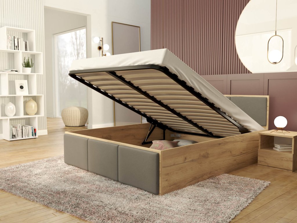 DOLLY kárpitozott franciaágy ágyneműtartóval - craft tölgy/grafit