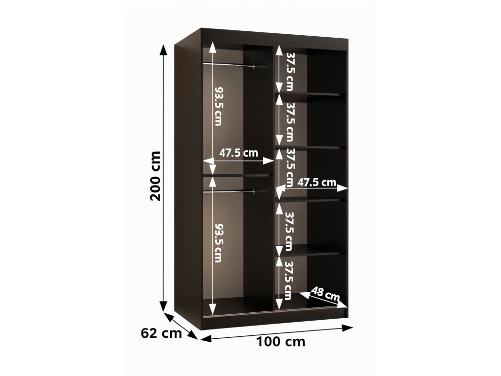 A belső tér kialakítását gondosan megtervezték a maximális tárolóhely biztosítása érdekében. Az egyik oldalon két fém akasztórúd és egy tágas polc ideális a ruhák felakasztására, míg a másik oldal négy tágas polccal van felszerelve, amelyek lehetővé teszik a ruhák, cipők vagy egyéb szükséges dolgok hatékony tárolását. A tolóajtós szekrény minőségi, 16 mm vastag laminált lapból készült, és ellenálló PVC éllel védett, ami hosszú élettartamot és tartósságot garantál. A Dome 3 hálószobai szekrény kiváló választás azoknak, akik a modern dizájn és a praktikusság tökéletes kombinációját keresik.