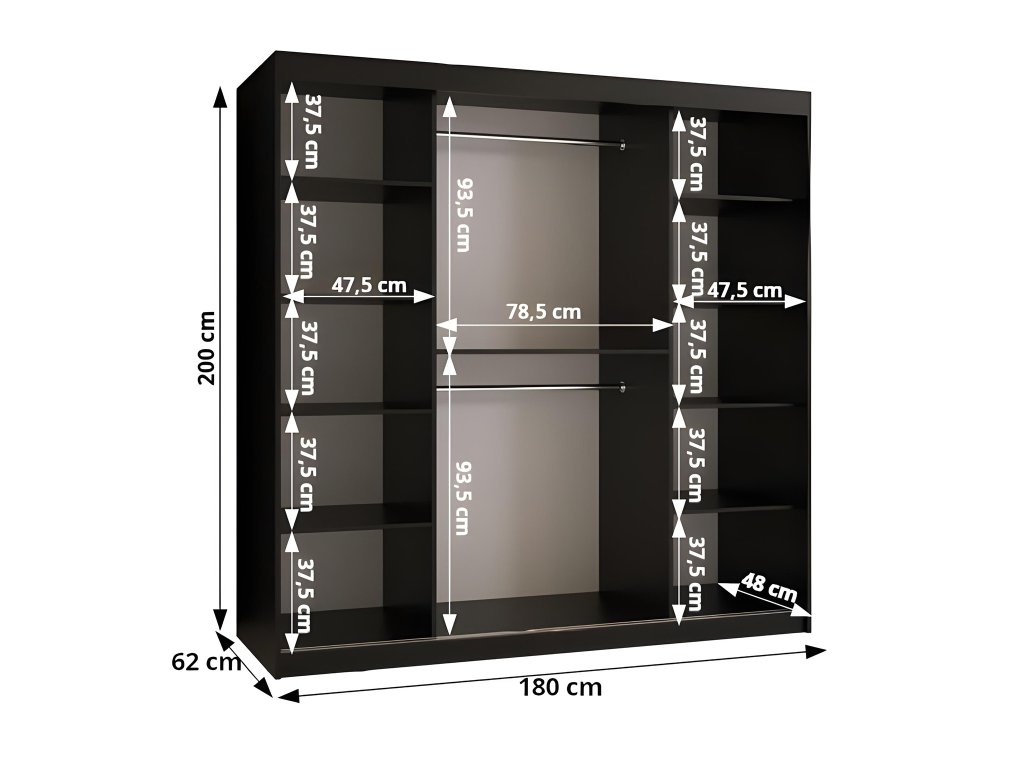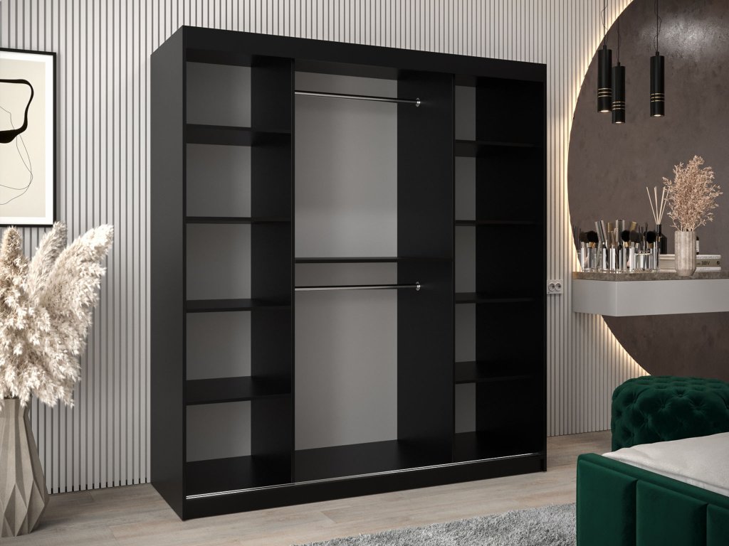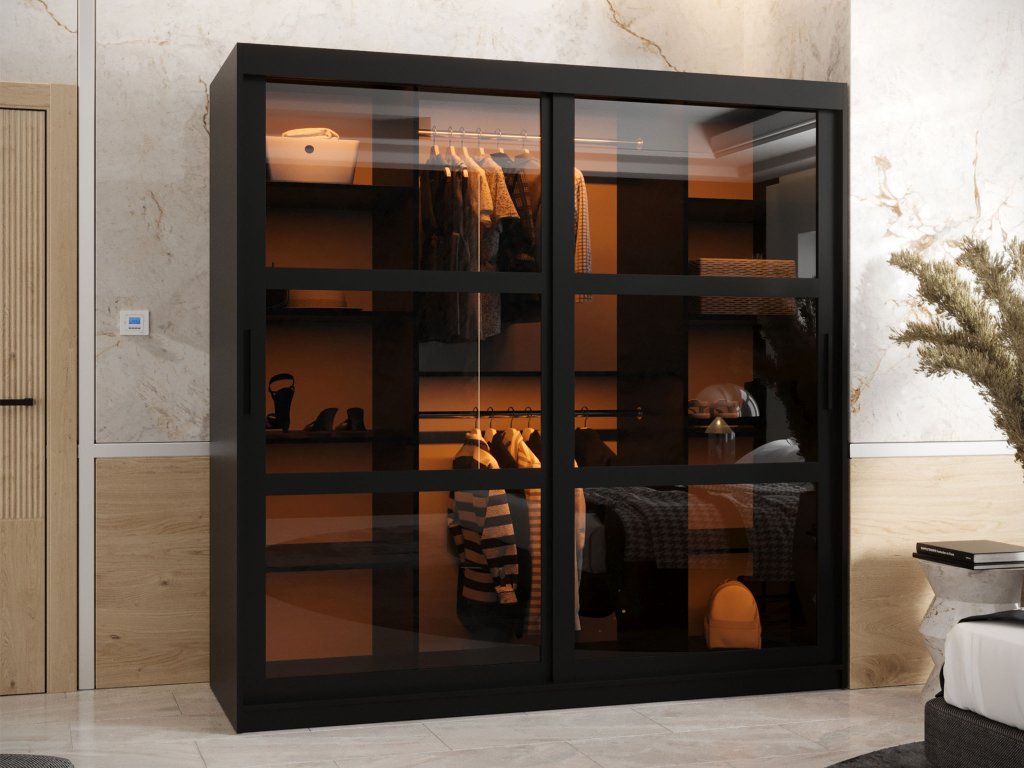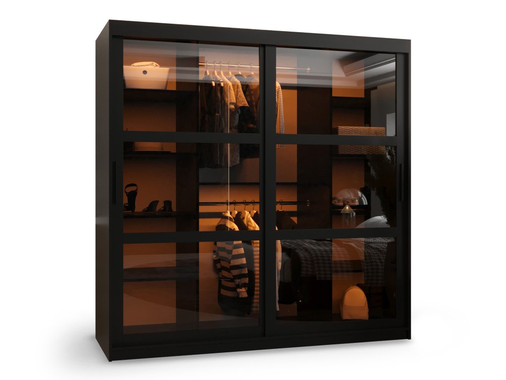A széles fekete Dome tolóajtós ruhásszekrény ideális megoldás a modern otthonok számára, amelyek praktikus és elegáns bútort keresnek. 180 cm szélességével és üvegezett ajtóival, amelyeket fekete fa lécek tagolnak, kifinomult megjelenést kölcsönöz otthonának. A fekete fogantyú modern hangsúlyt ad a bútornak, és tökéletesen illeszkedik az összképhez.